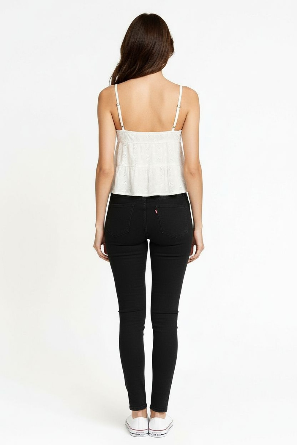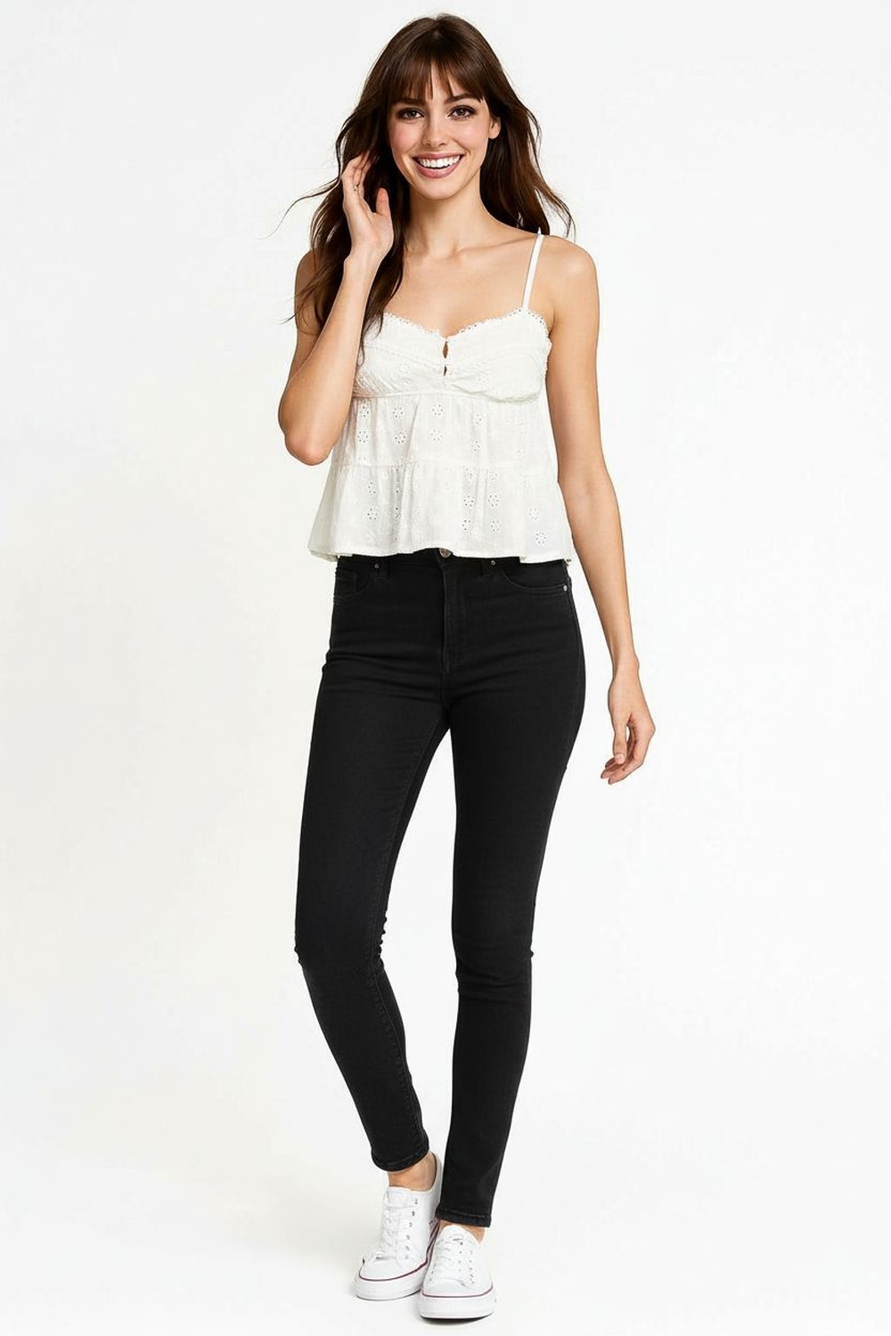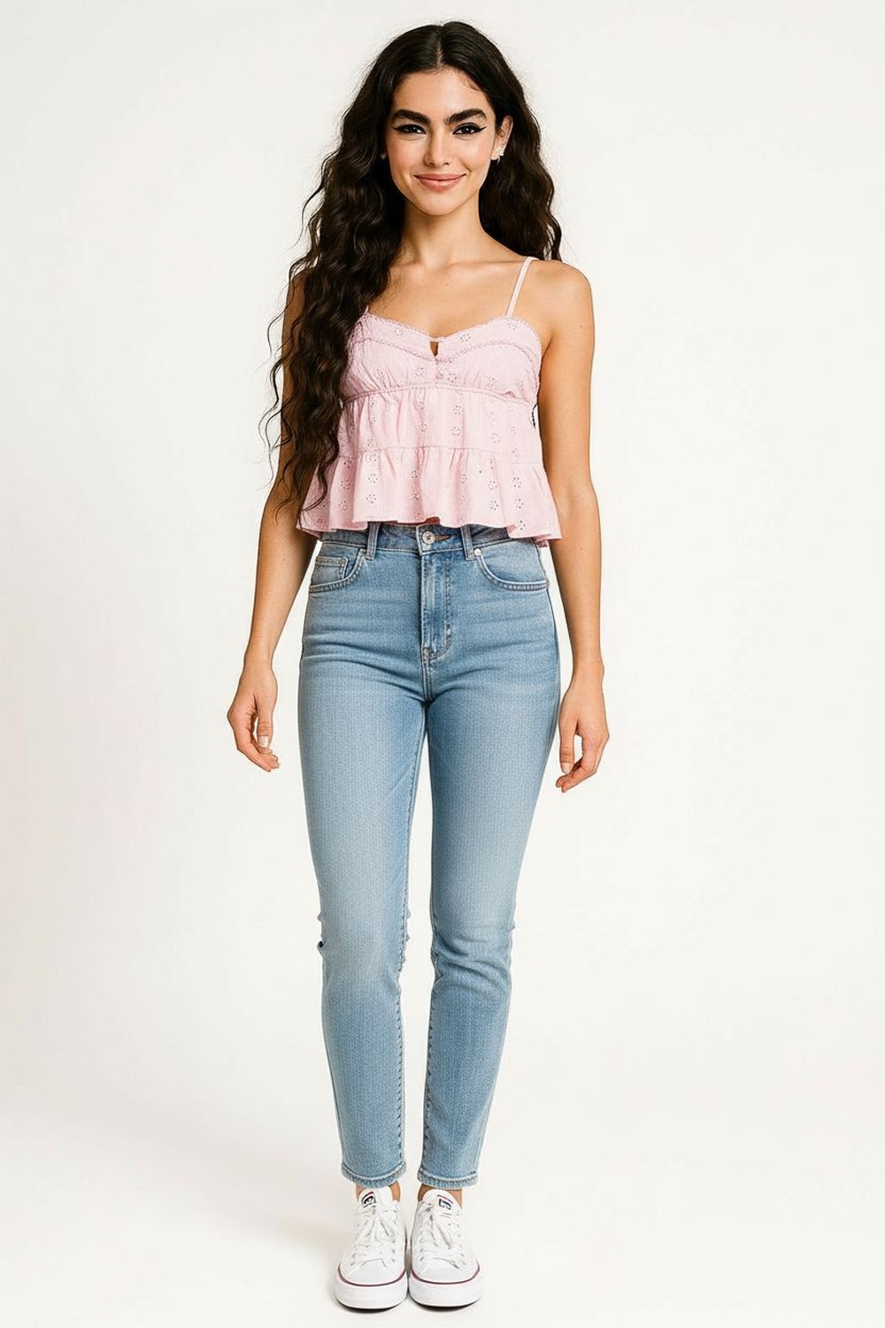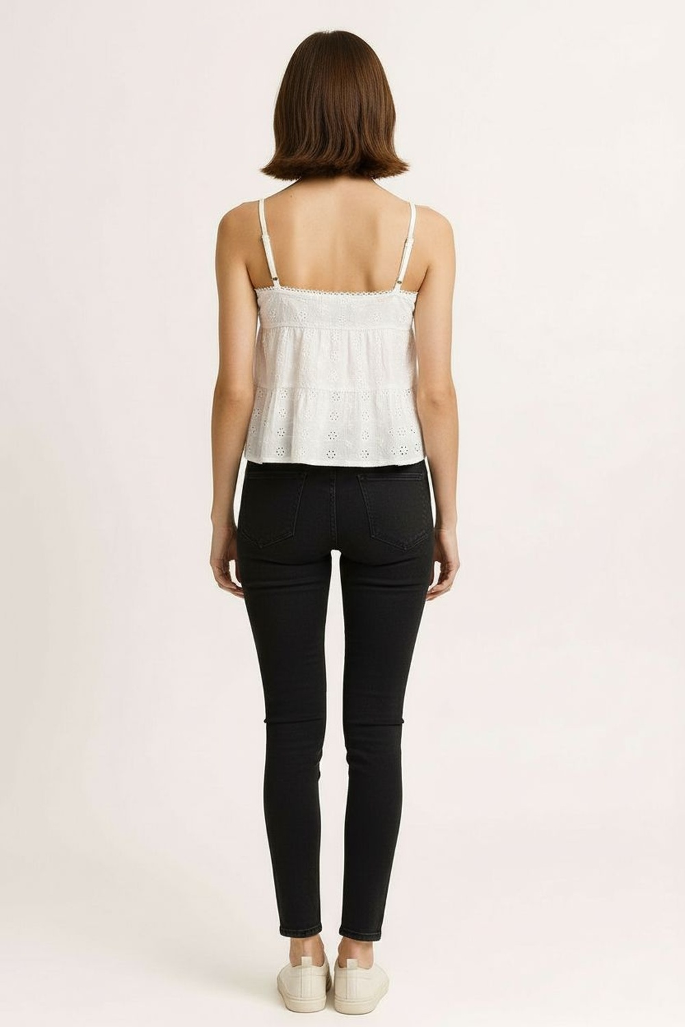 Blusa con tirantes delgados, escote recto con detalle de botones, cuerpo con bordado decorativo, corte bajo busto, terminación con olan en bajo