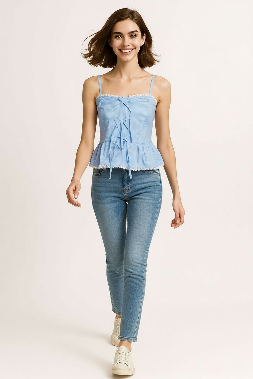 Blusa de tirantes delgados con escote recto y estructura ligera, detalle de moños frontales funcionales que permiten ajustar el escote, corte a la cintura con ligero vuelo en el bajo que aporta movimiento, terminación con encaje decorativo en orilla que añade acabado delicado, confección fresca y cómoda para uso continuo