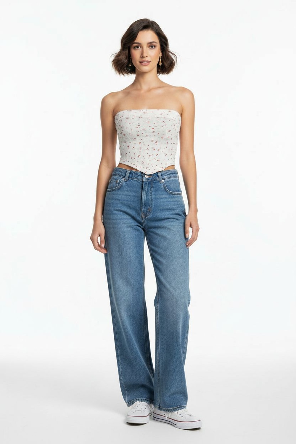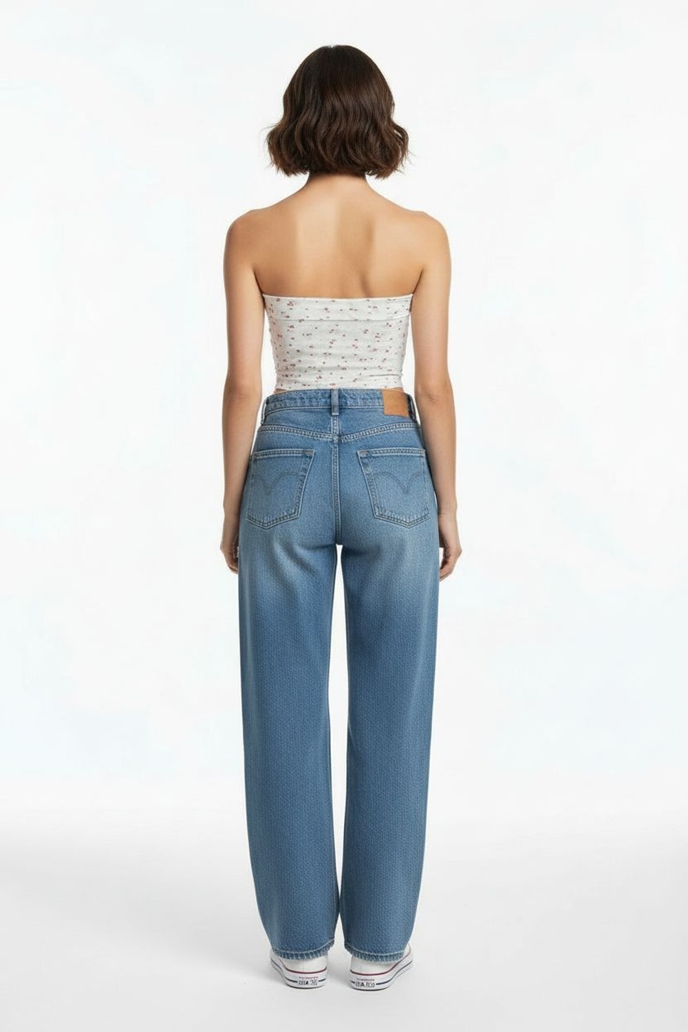 Jeans corte campana con cierre frontal botón pretina con trabillas diseño de cinco bolsillos ajuste a cadera y pierna con apertura gradual