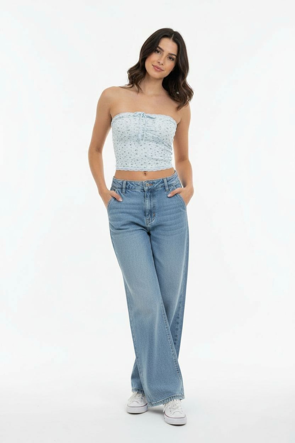 Top tipo banda con tirantes delgados, ajuste al cuerpo, jareta frontal ajustable, corte recto, terminado limpio en orillas