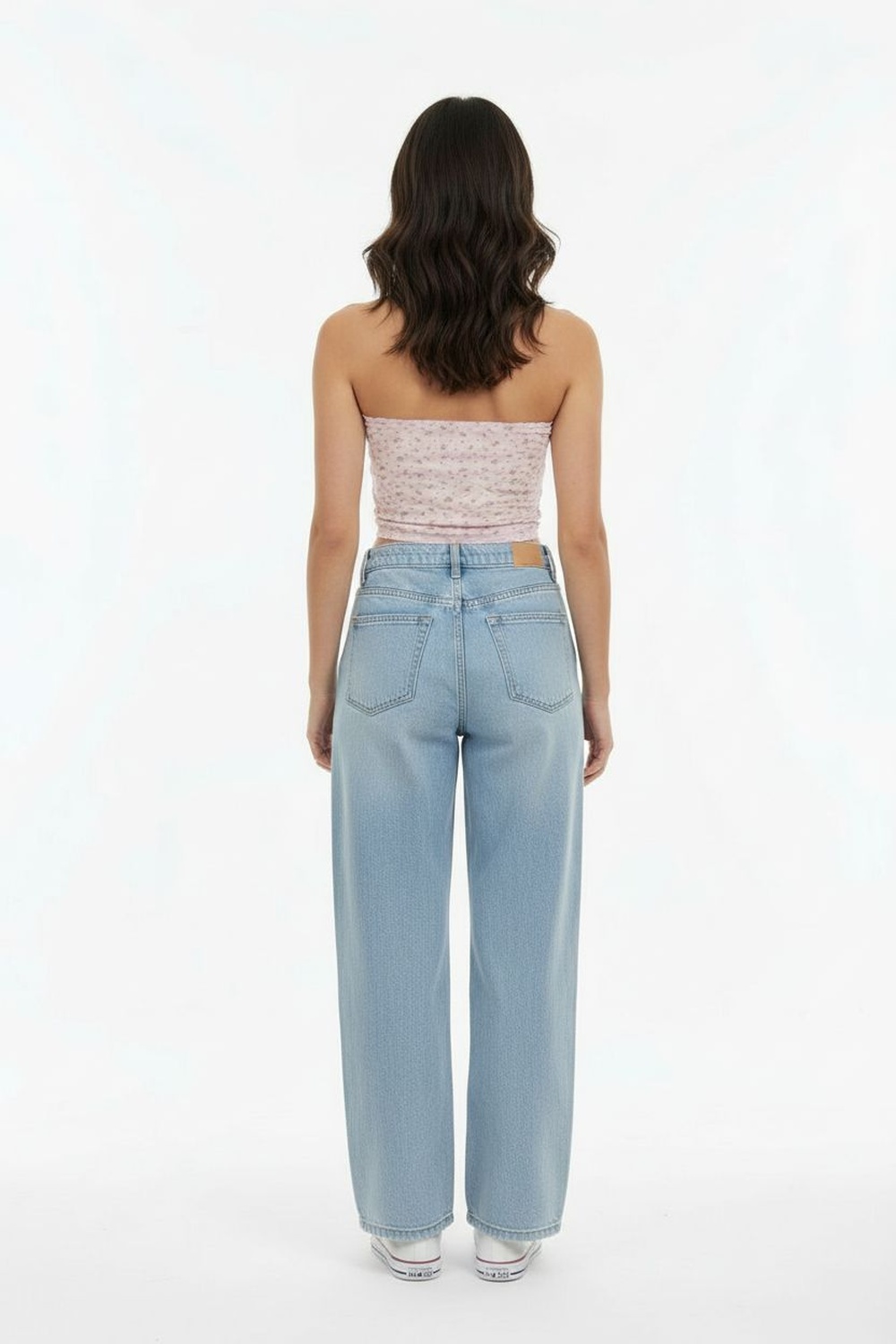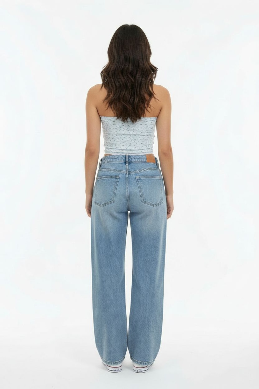 Jeans corte campana con cierre frontal botón pretina con trabillas diseño de cinco bolsillos ajuste a cadera y pierna con apertura gradual