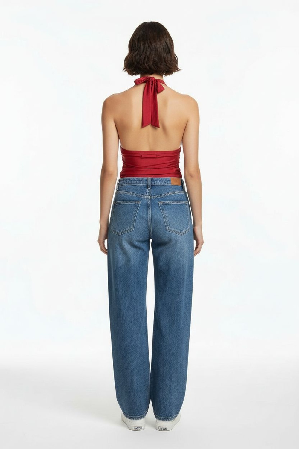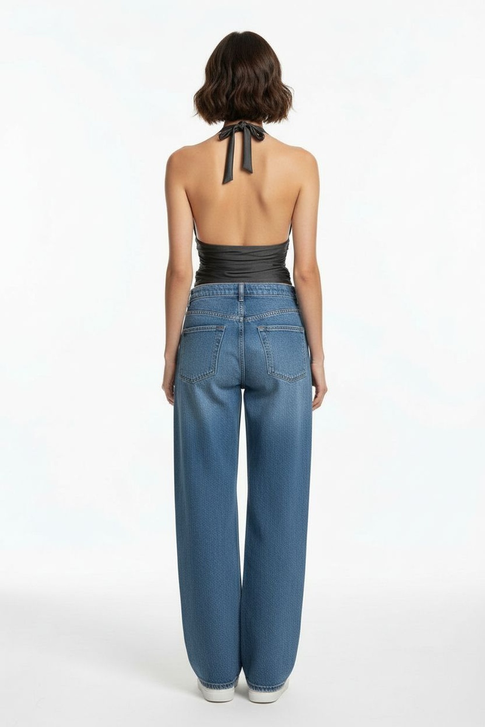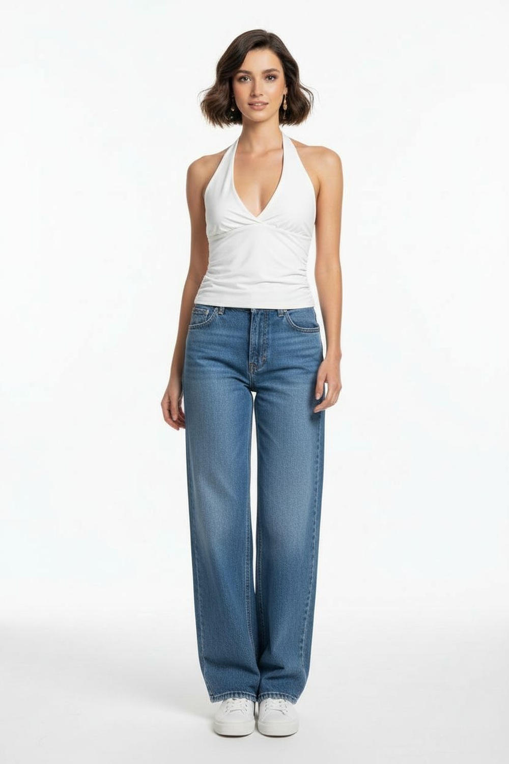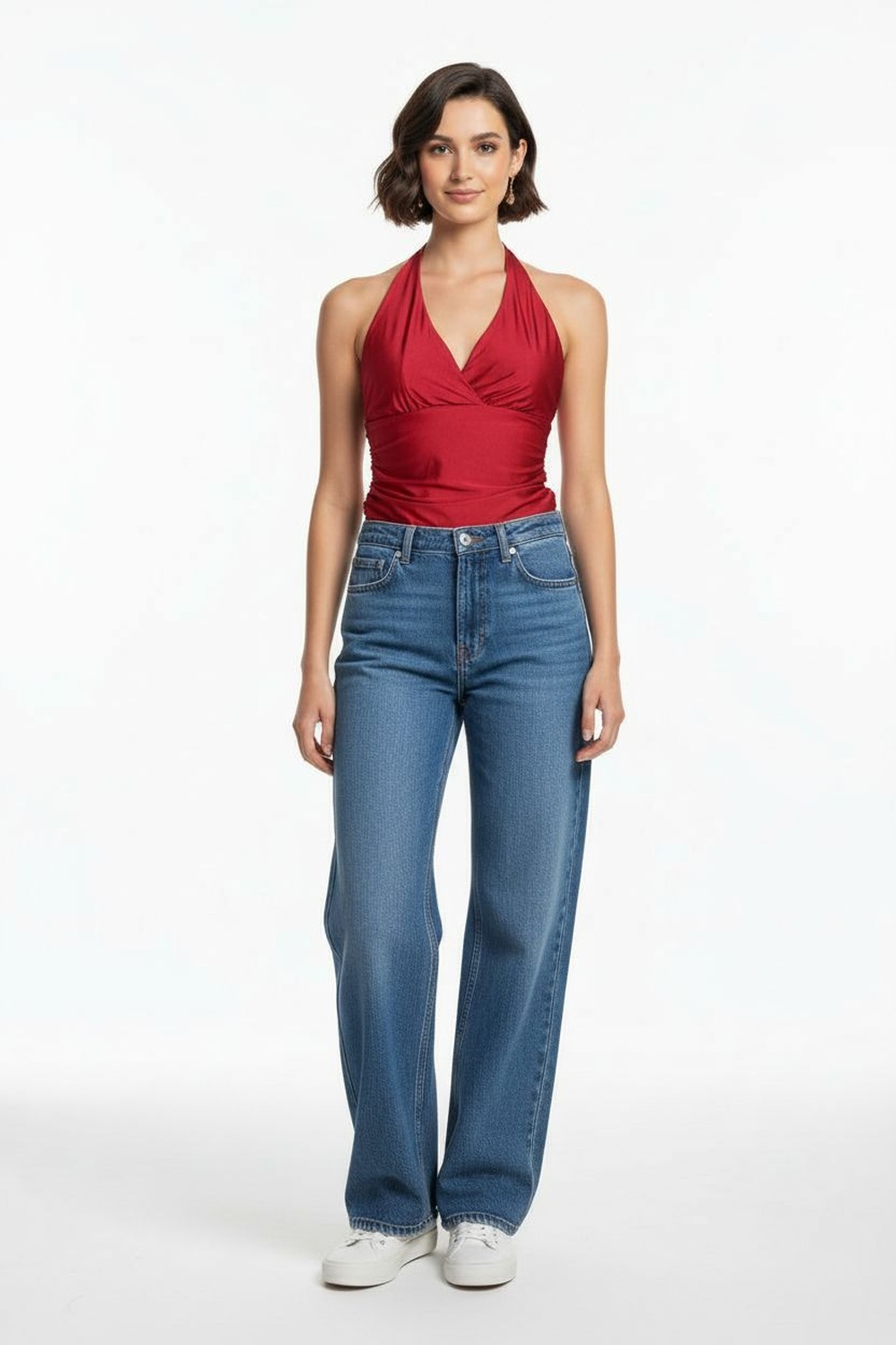 Top halter con escote profundo amarre en cuello ajuste lateral con efecto plisado estructura adaptable silueta entallada