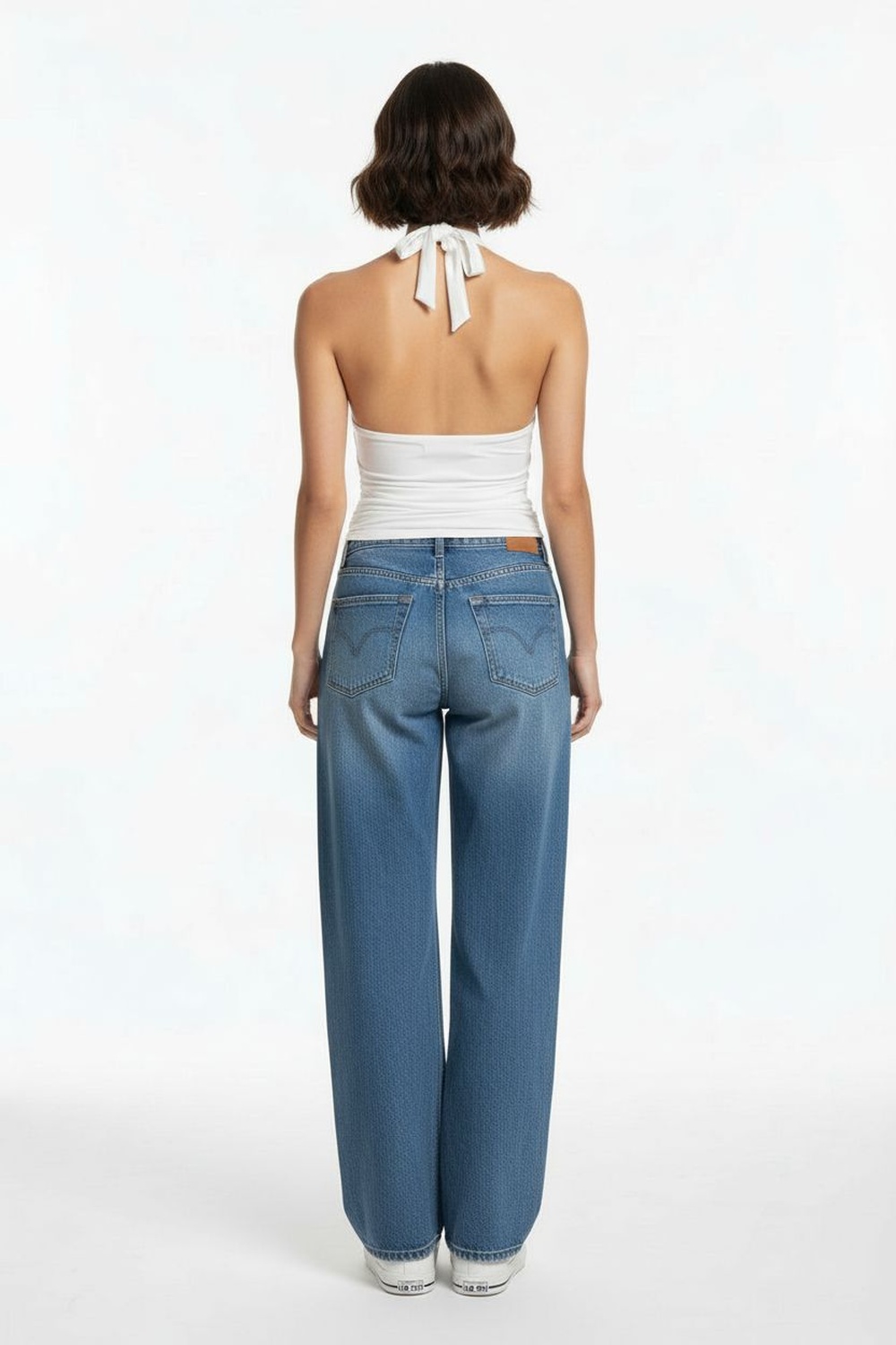 Blusa tipo halter con tirantes delgados, detalle de encaje en cuerpo, diseño con espalda descubierta y amarre superior, caída ligera con borde ondulado