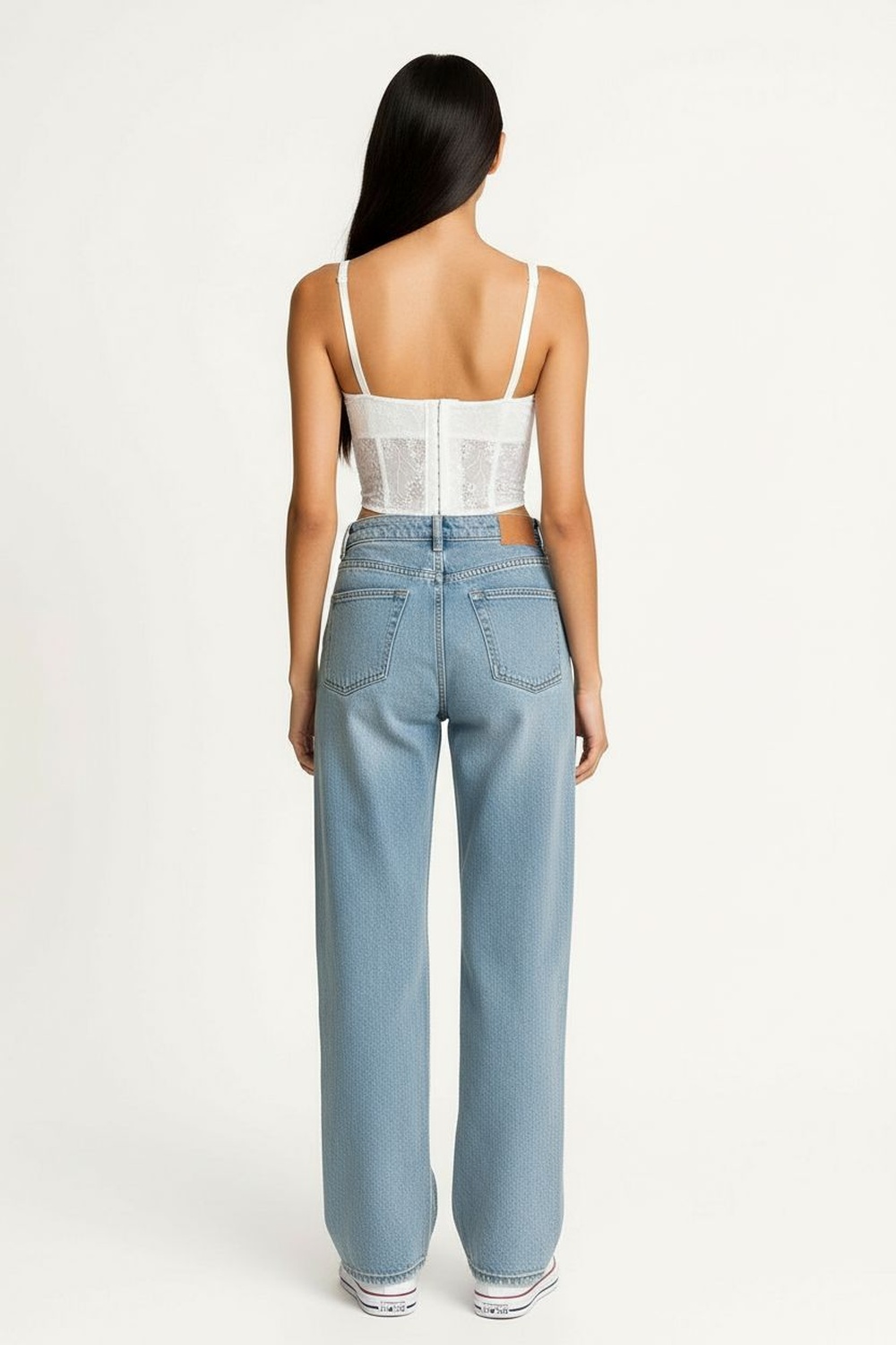 Jeans de tiro medio con cinco bolsillos, cierre frontal con botón y cremallera, bordado decorativo, ajuste recto, terminado en bajo