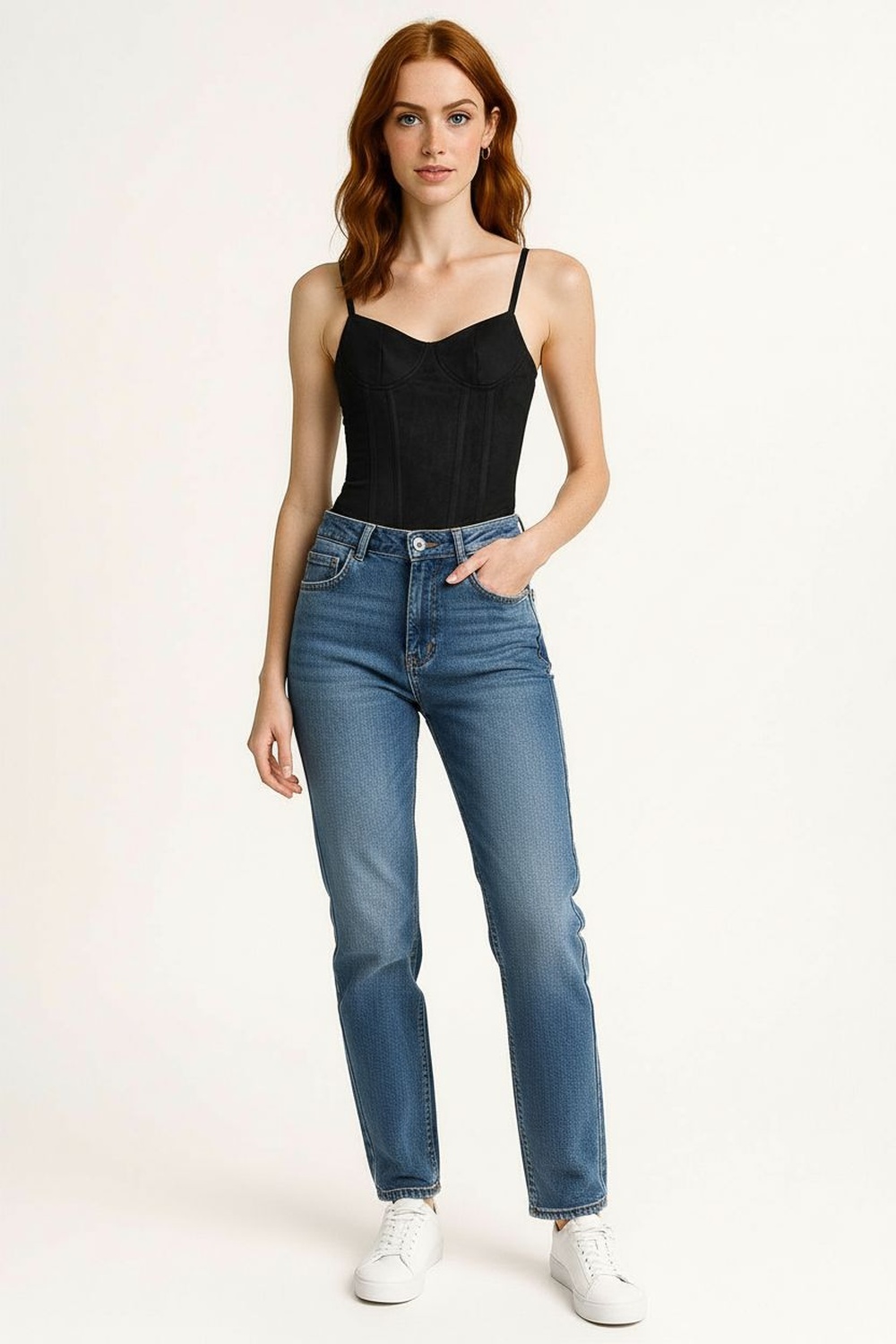 Body con tirantes delgados ajustables que permiten un calce personalizado, escote en V con estructura definida que realza la figura, cortes verticales al frente que estilizan la silueta, ajuste ceñido que aporta seguridad y comodidad, confección en tela elástica con acabado brillante que asegura movilidad, ideal para outfits nocturnos o combinaciones modernas de temporada