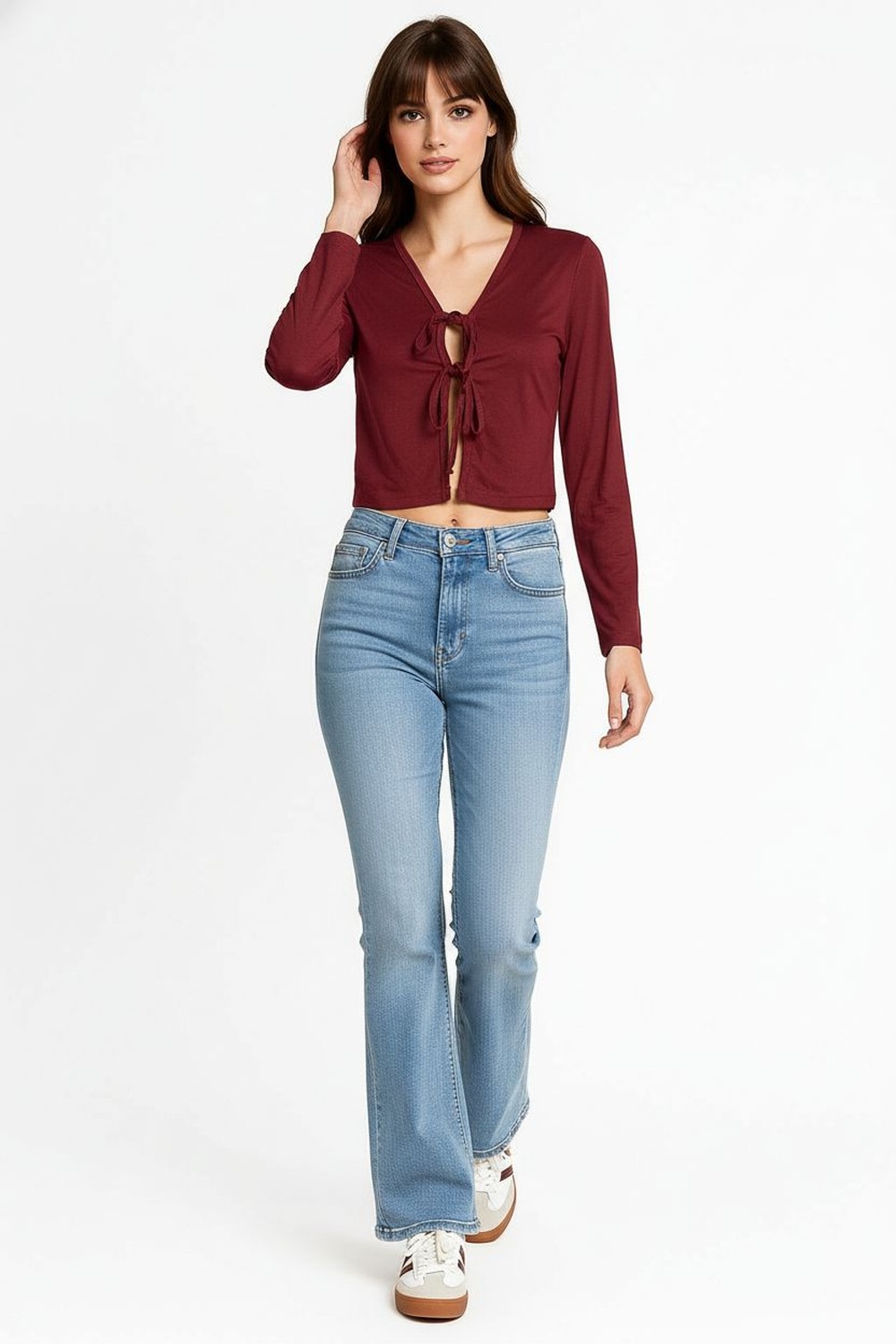 Bolero corto de manga larga con escote en pico profundo, cintas frontales para amarre que permiten ajuste personalizado, confeccionado en tejido suave con textura cepillada que brinda confort, estructura ligera con caída natural y acabados delicados para un look moderno y versátil