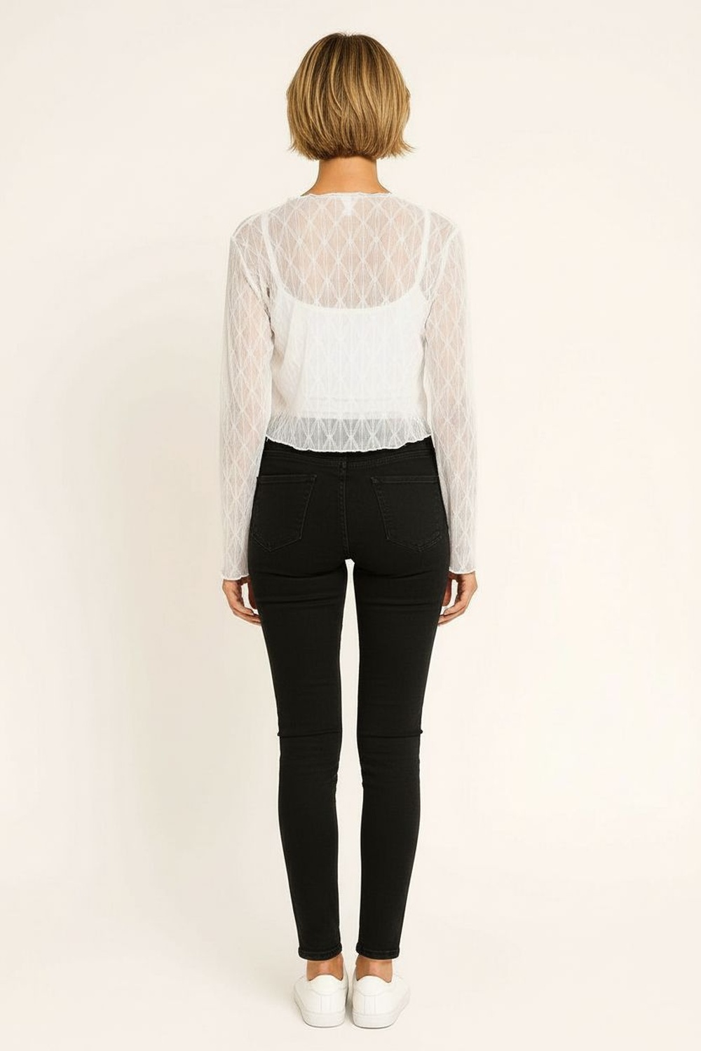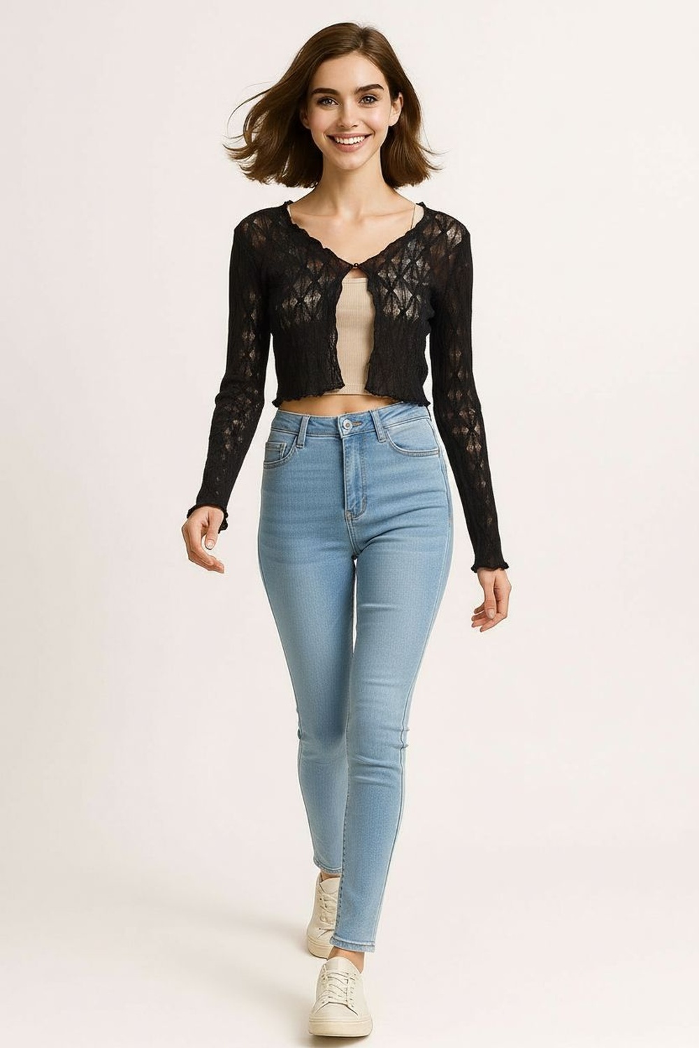 Bolero de encaje manga larga, abertura frontal, corte corto, textura calada ligera, terminación recta, confección flexible