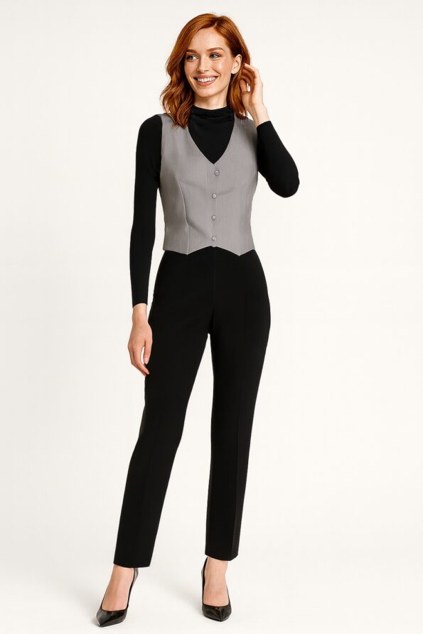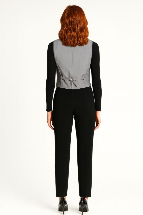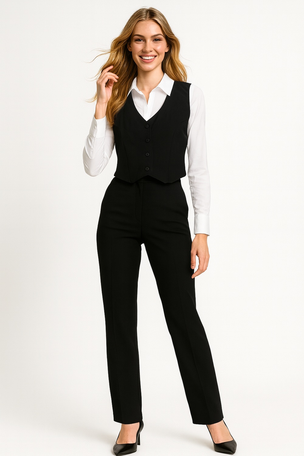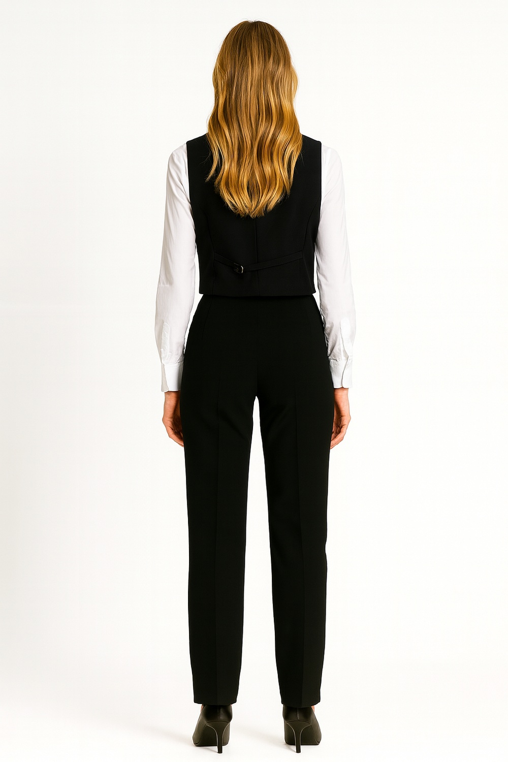 Chaleco corto con escote en V profundo que estiliza el cuello, botones al frente que aportan practicidad y detalle decorativo, bajo en punta que alarga visualmente la silueta, sin mangas para mayor frescura y fácil combinación con diferentes prendas, confeccionado en tejido estructurado que brinda soporte y mejor caída, ideal para looks modernos y combinaciones versátiles de temporada