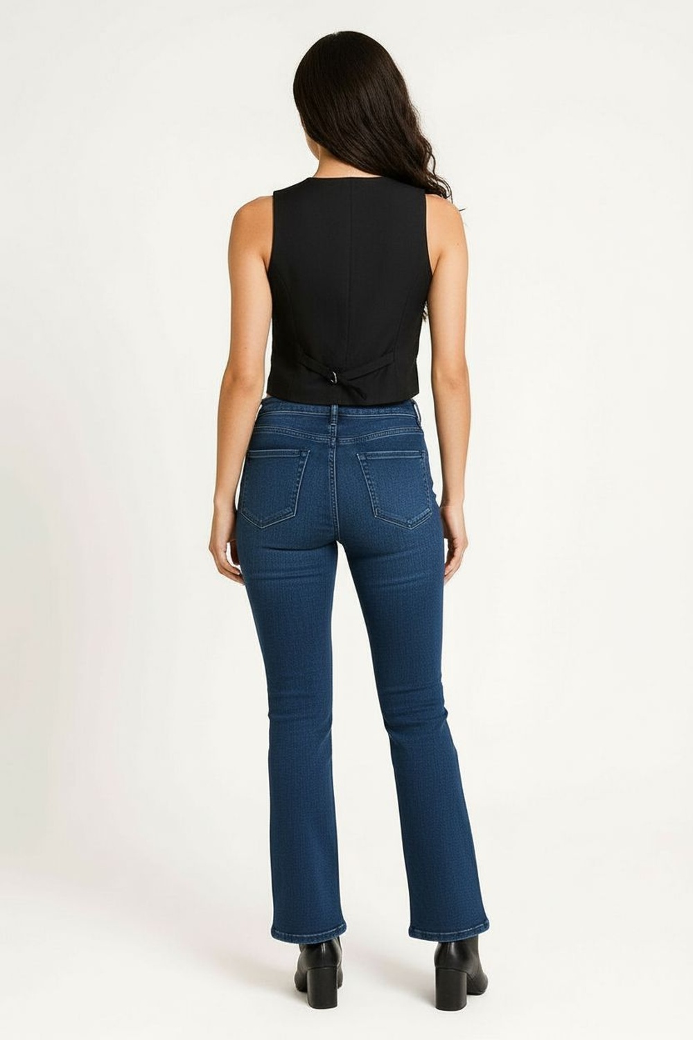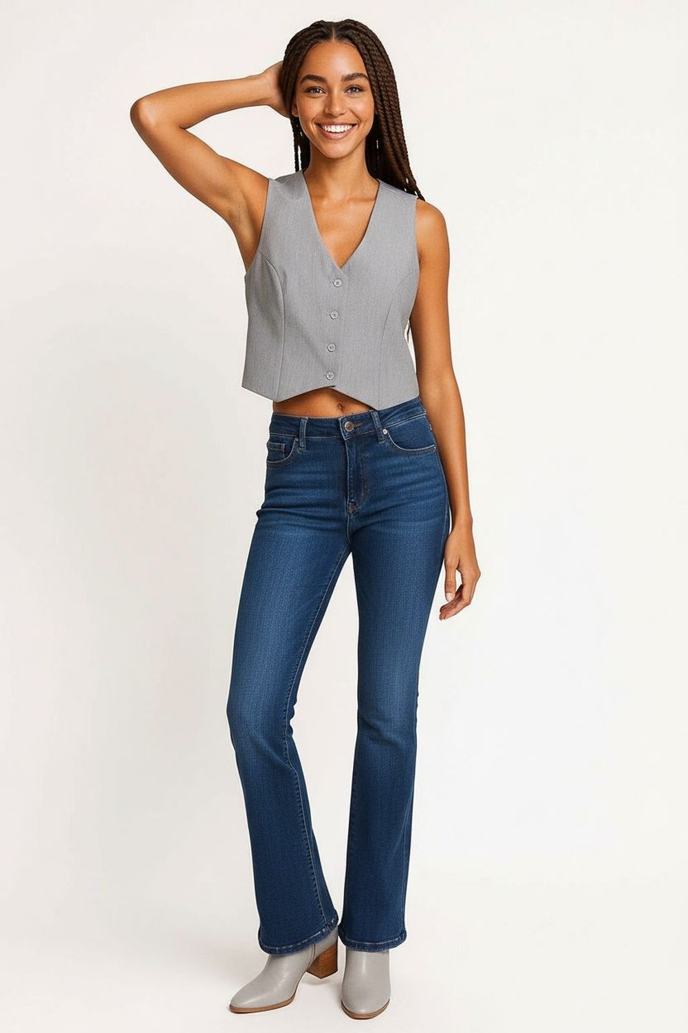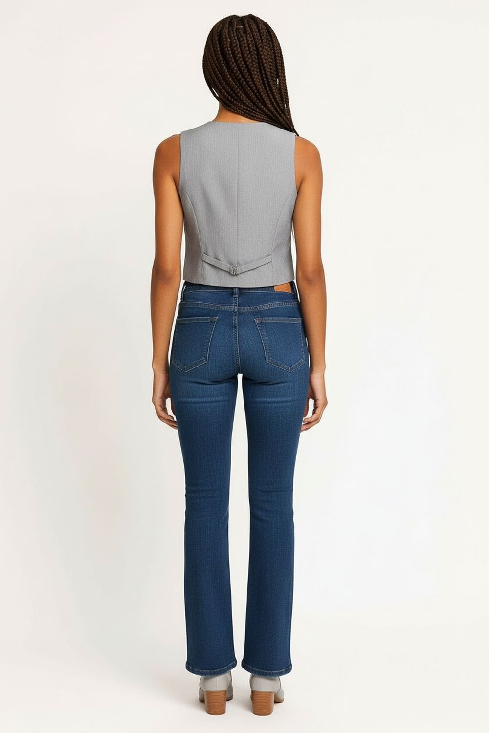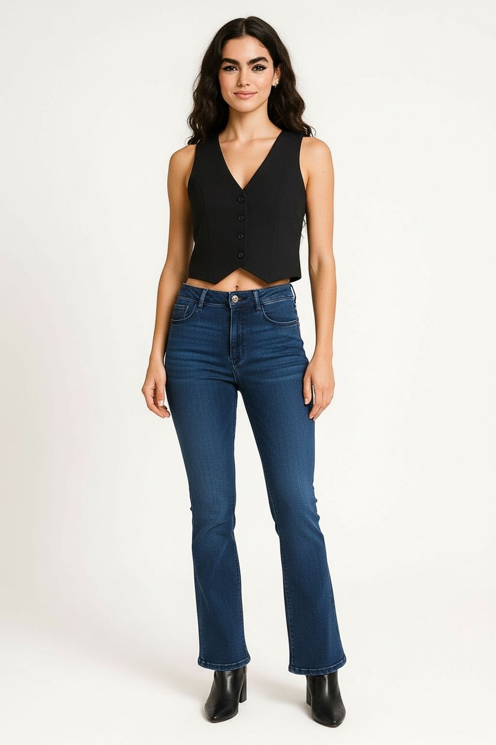 Chaleco corto confeccionado en mezclilla tipo stretch que ofrece comodidad y libertad de movimiento