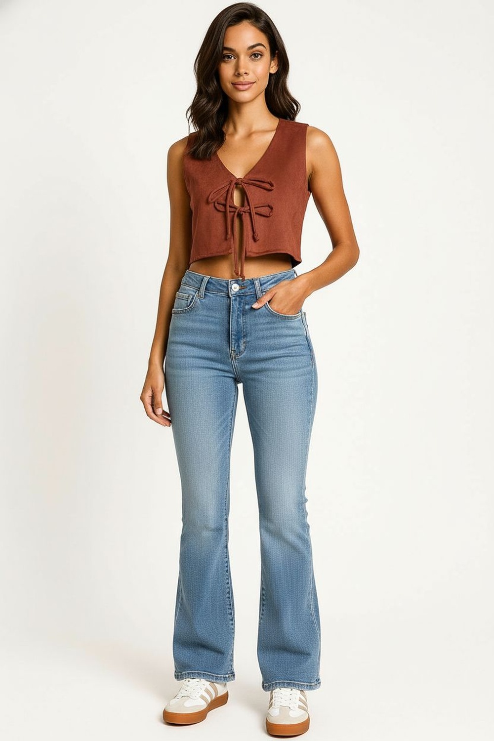 Chaleco crop con textura, cuello redondo abierto con cintas de amarre