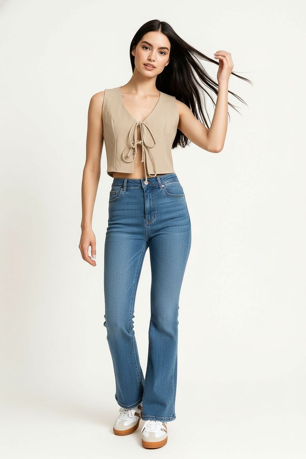 Chaleco confeccionado en tejido liso con diseño moderno, escote en V que estiliza el cuello, amarre doble al frente que permite ajustar el fit, acabado estructurado que aporta un toque sofisticado y actual