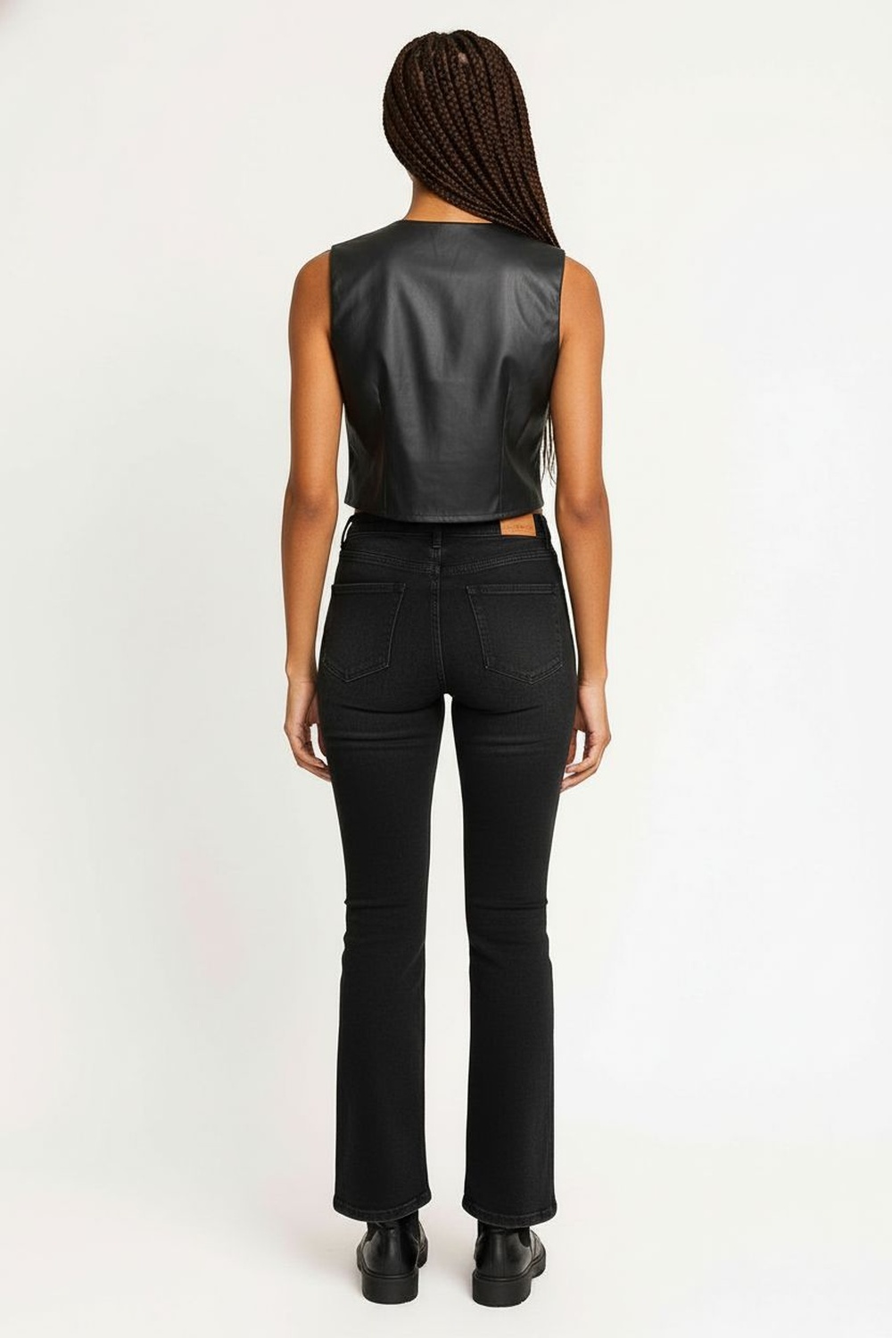 Chaleco corto sin mangas con escote en pico y cierre frontal de botones al tono, confeccionado en material tipo PVC de acabado pulido, estructura ajustada que define la silueta, costuras marcadas que refuerzan el diseño y agregan detalle visual, ideal para looks modernos con toque urbano