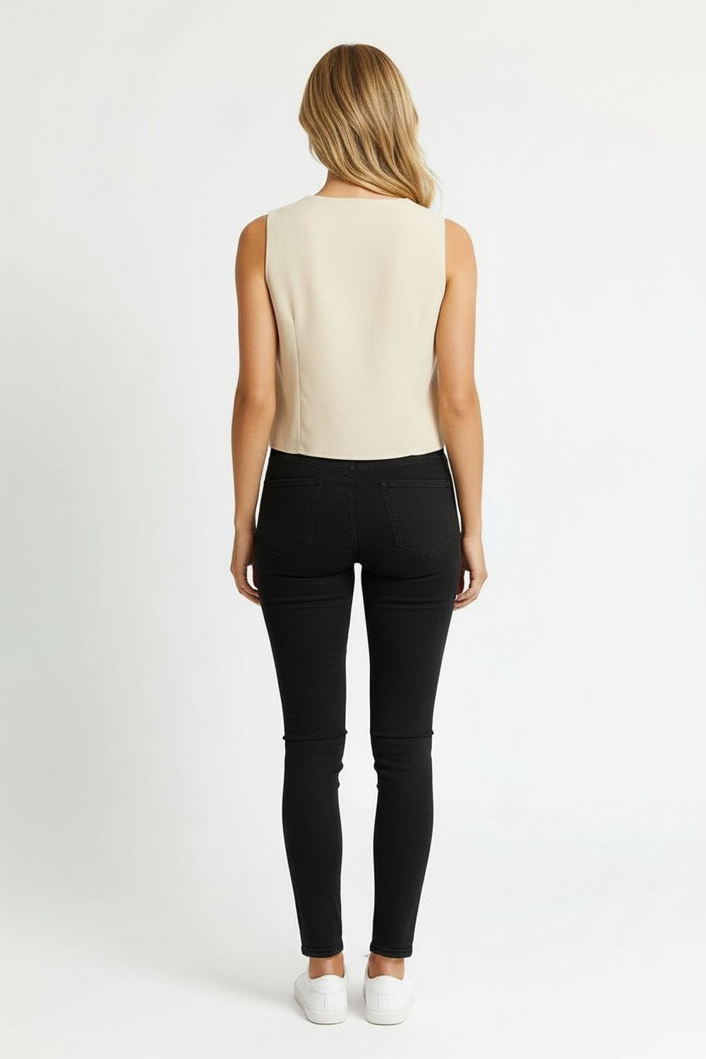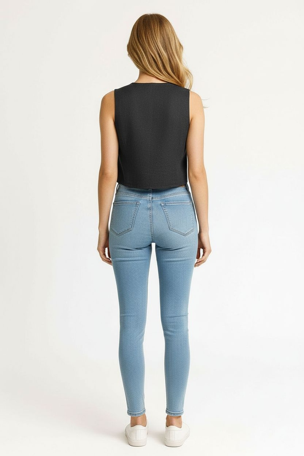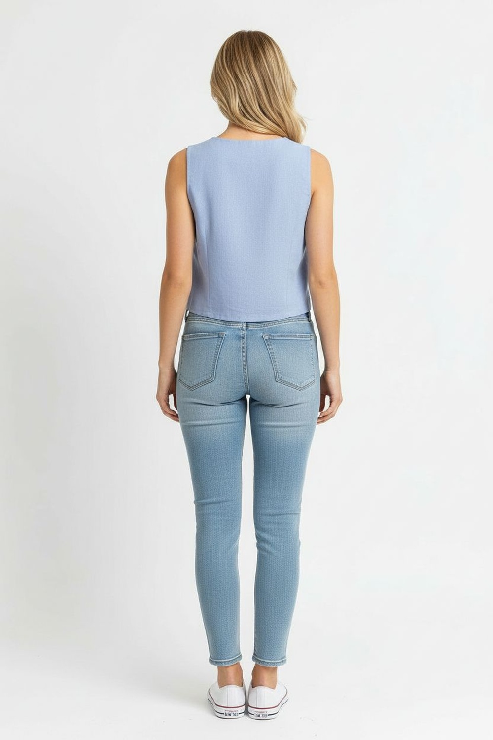 Chaleco de mezclilla con corte entallado que define la figura, solapa clásica y botonadura frontal metálica que aporta estructura, diseño sin mangas que permite mayor versatilidad, pinzas delanteras y traseras que mejoran el ajuste al cuerpo, bajo en pico que estiliza la zona de la cintura y acabado firme de alta resistencia