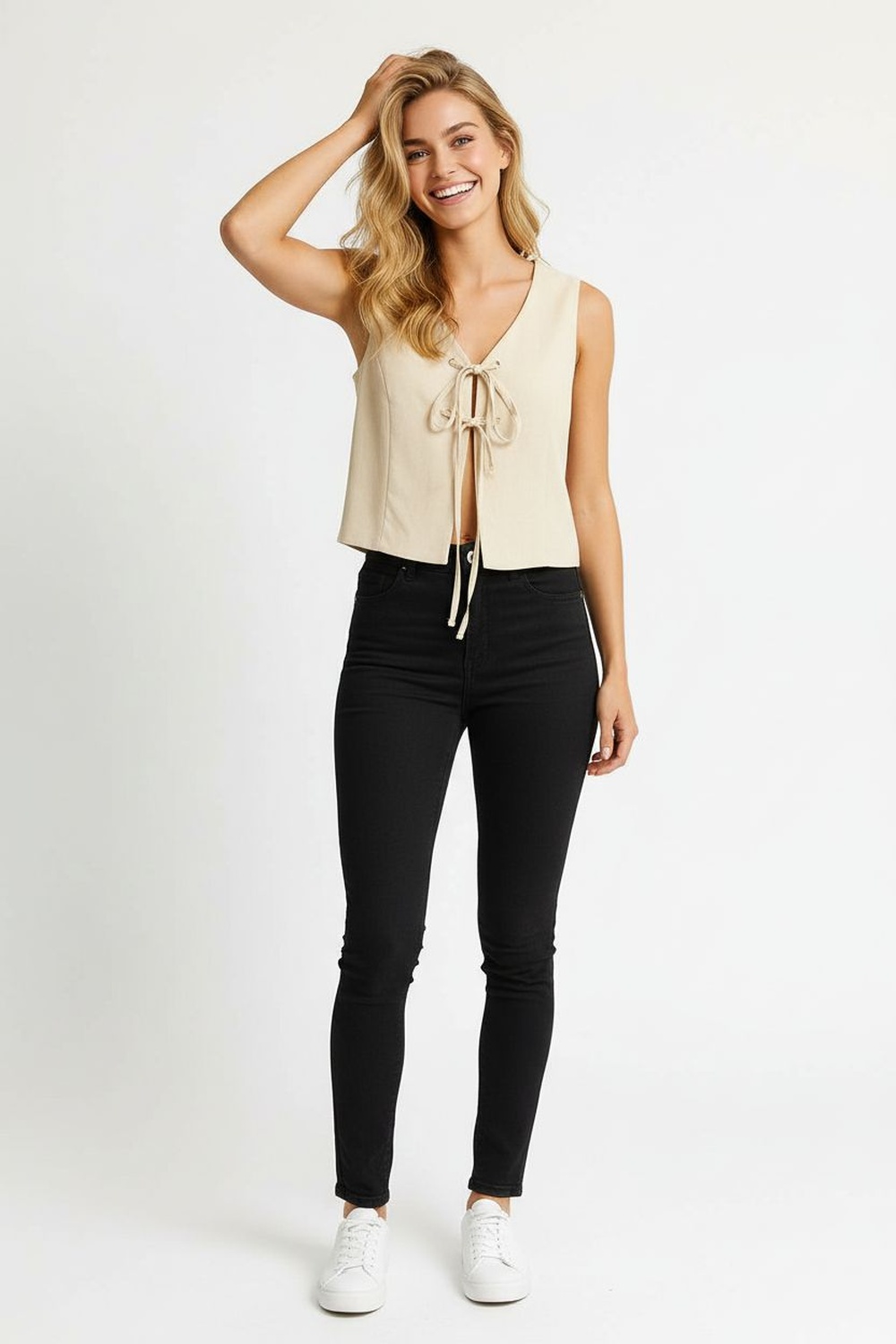 Chaleco de lino, escote en V, cierre frontal con amarres, corte recto, estructura ligera, ajuste cómodo, sin mangas