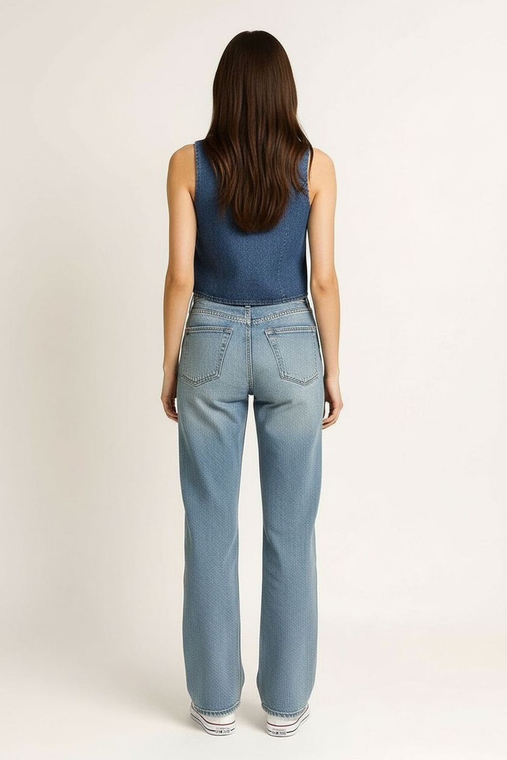 Chaleco en mezclilla con escote en V profundo que estiliza la parte superior, diseño sin mangas con corte a la cintura que resalta la silueta, amarre frontal ajustable que permite regular la abertura, estructura firme con costados definidos que aportan mejor ajuste al cuerpo