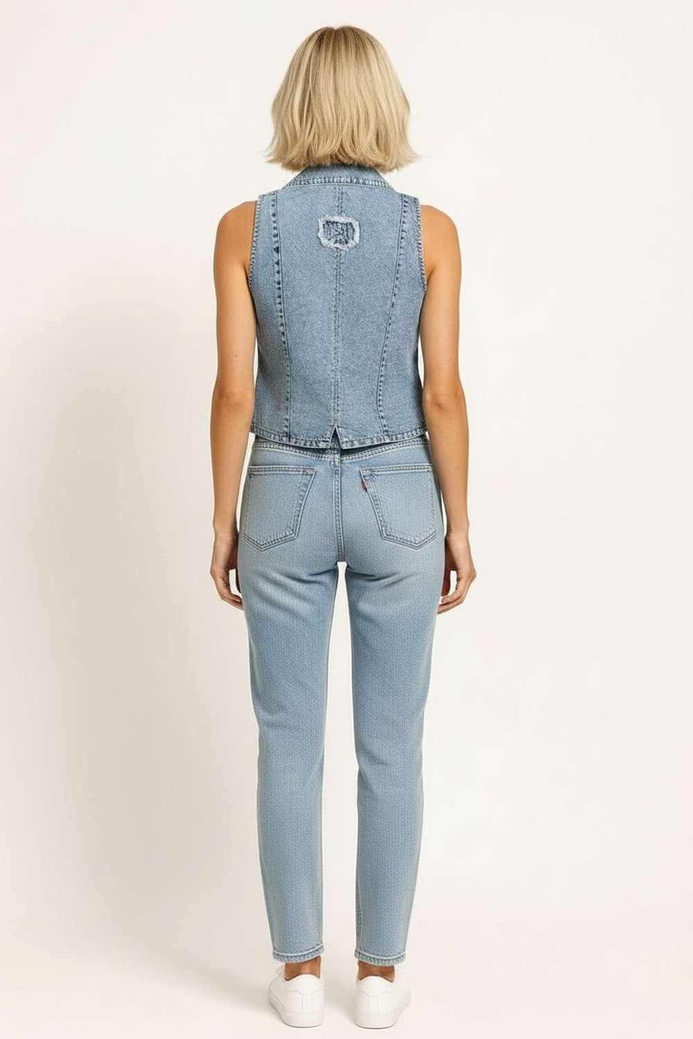 Chaleco de mezclilla con corte entallado que define la figura, solapa clásica y botonadura frontal metálica que aporta estructura, diseño sin mangas que permite mayor versatilidad, pinzas delanteras y traseras que mejoran el ajuste al cuerpo, bajo en pico que estiliza la zona de la cintura y acabado firme de alta resistencia