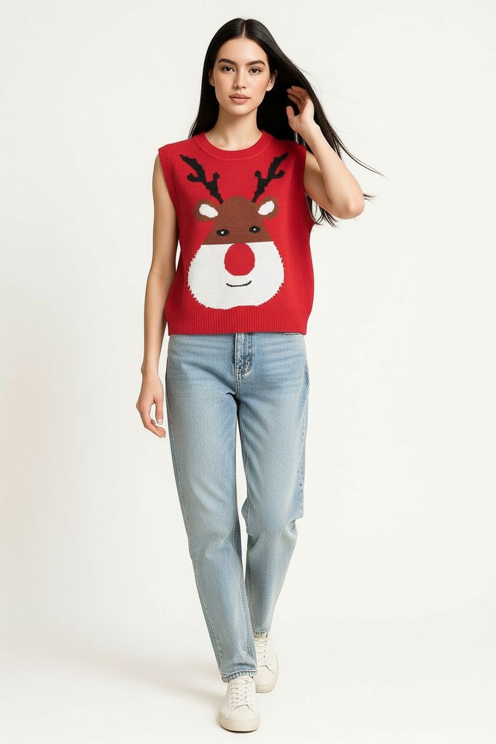 Chaleco tejido sin mangas con diseño frontal alusivo a temporada, cuello redondo y terminaciones acanaladas que aportan estructura, tejido suave que mantiene calidez y confort, largo a la cintura que facilita la combinación con distintas prendas
