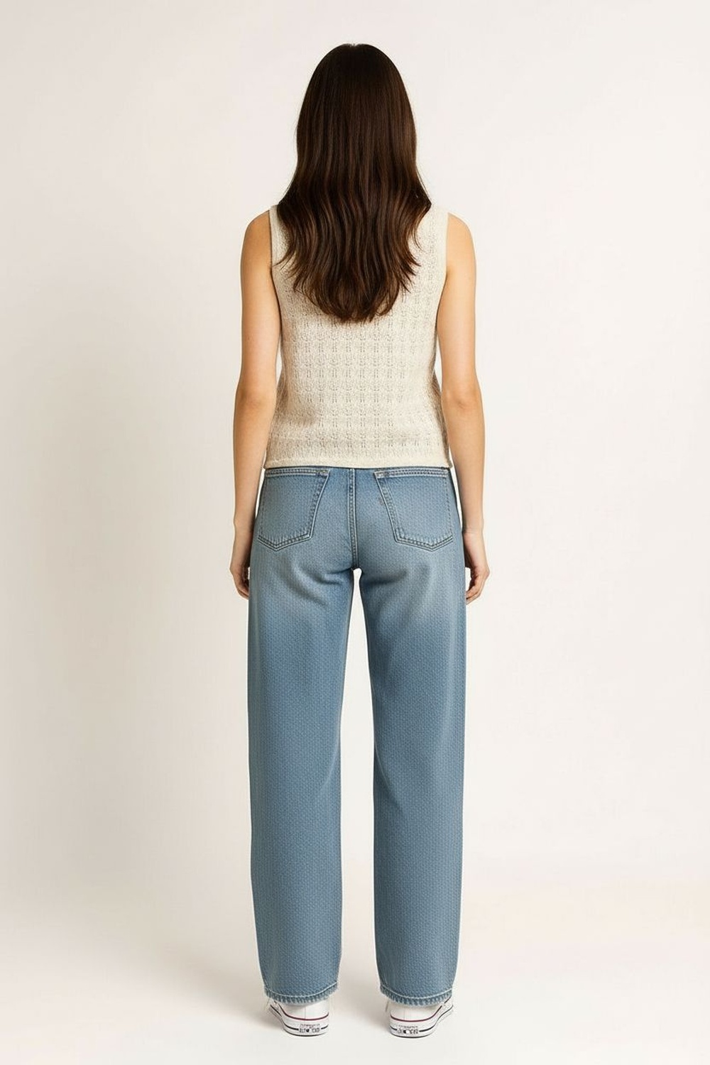 Chaleco tejido en viscosa con escote en V pronunciado que alarga visualmente el cuello, botonadura frontal funcional que facilita el ajuste, tejido calado con textura definida que aporta frescura y ligereza, corte recto con bajo ligeramente ondulado que brinda movimiento natural