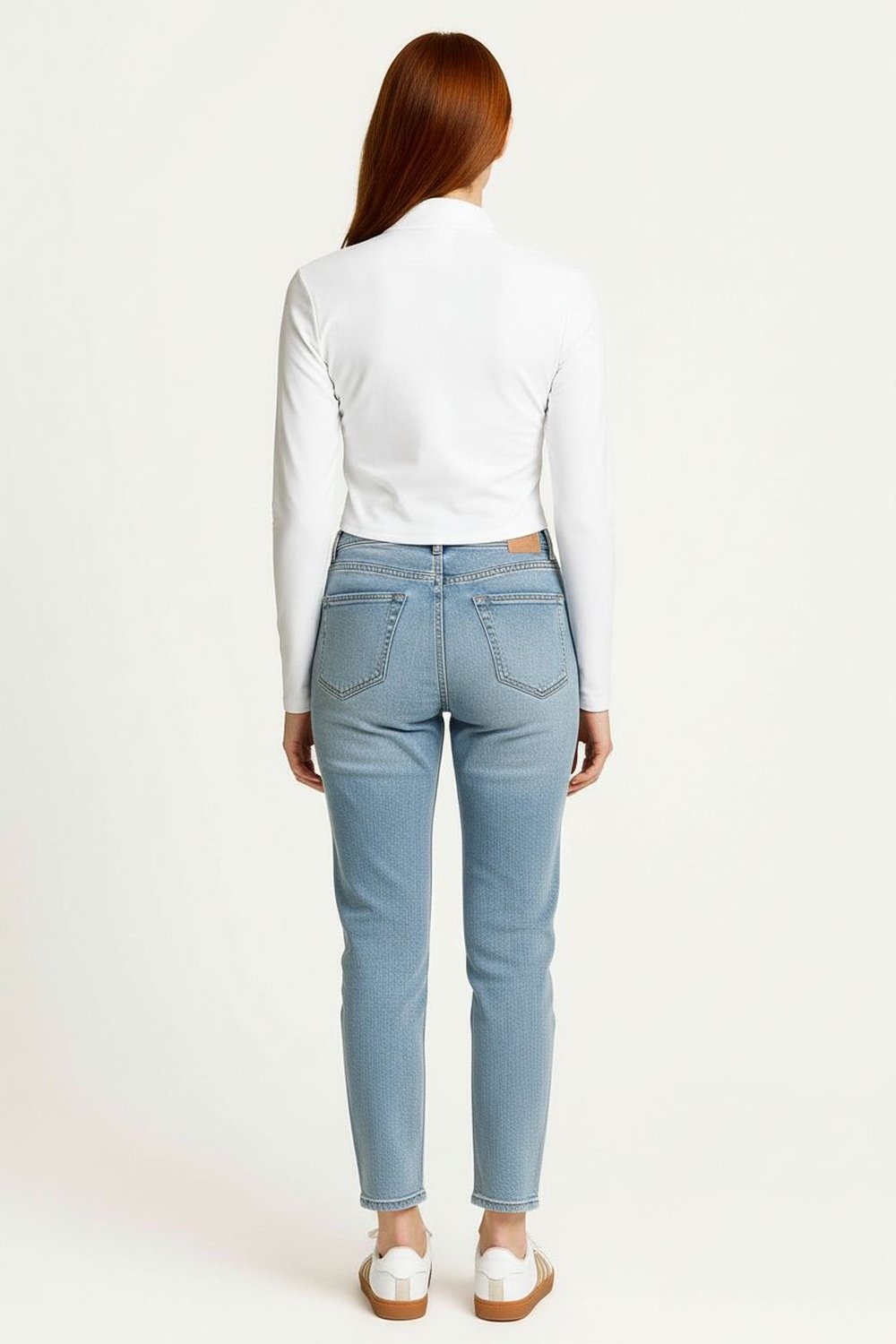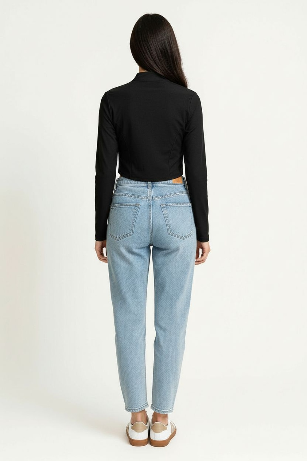 Chamarra de mezclilla con corte corto que define la cintura y resalta la figura, cierre de botones al frente que permite un ajuste práctico y moderno, bolsillos decorativos que añaden estilo funcional, terminado deshilado que aporta un toque juvenil y contemporáneo