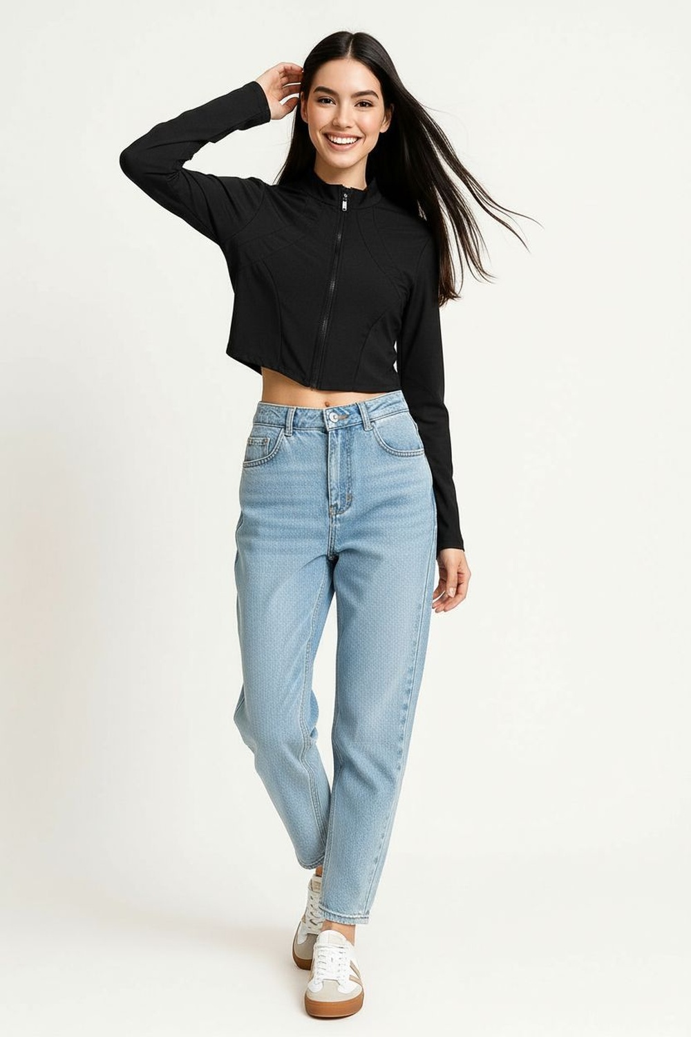 Chamarra corta de manga larga con cuello alto, cortes decorativos al frente y en espalda que definen la silueta, cierre metálico al frente que facilita el ajuste, confeccionada en tejido elástico que brinda comodidad y libertad de movimiento, acabado limpio con estructura ligera que aporta estilo moderno y deportivo