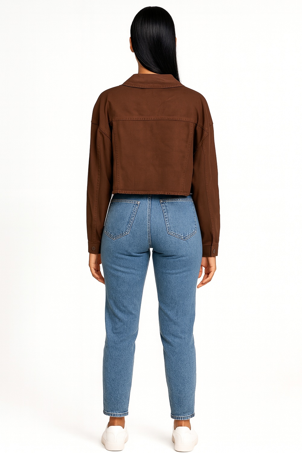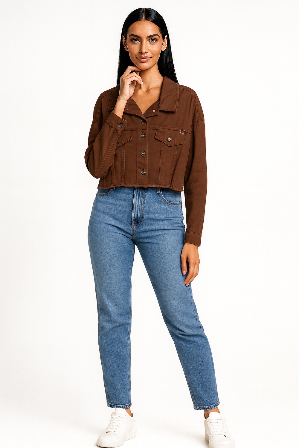 Chamarra de corte corto con cuello clásico, botones frontales metálicos, bolsillos superiores con tapa, costuras definidas que estructuran la silueta, terminación deshilada en el bajo que aporta acabado actual y confección resistente para uso diario