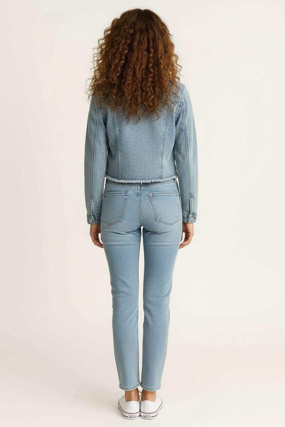 Chamarra con cuello camisero, cierre frontal con botones, bolsillos frontales funcionales, acabado deshilado en terminaciones, estructura corta