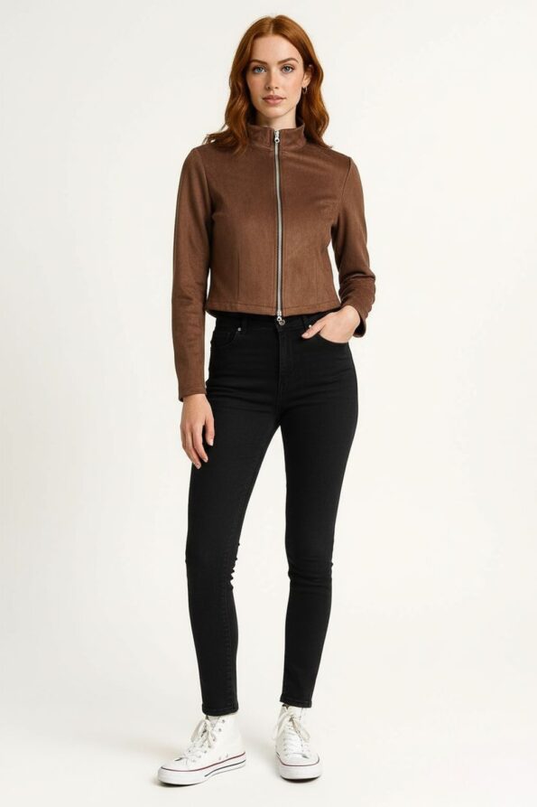 Chamarra corta con cuello alto estructurado que aporta un toque moderno, cierre frontal metálico de doble vía que permite ajustar la apertura al gusto, corte entallado que define la figura y resalta la cintura, confección en tejido tipo gamuza de tacto suave que brinda una sensación cómoda y elegante, acabado interior limpio que asegura confort durante su uso