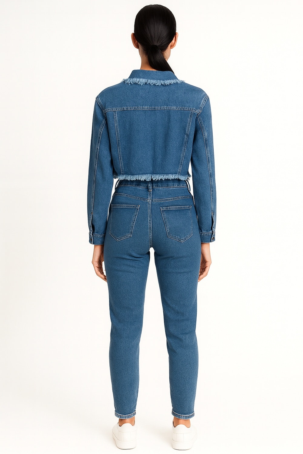 Chamarra de mezclilla con corte corto que define la cintura y resalta la figura, cierre de botones al frente que permite un ajuste práctico y moderno, bolsillos decorativos que añaden estilo funcional, terminado deshilado que aporta un toque juvenil y contemporáneo