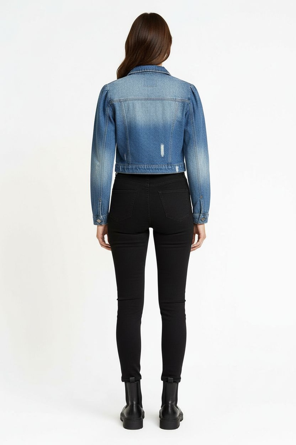 Chamarra de mezclilla con corte a la cintura que define la silueta, mangas largas con pliegues en hombros que aportan estructura, cierre frontal con botonadura metálica funcional, bolsillos delanteros aplicados con tapa, acabado resistente pensado para uso continuo