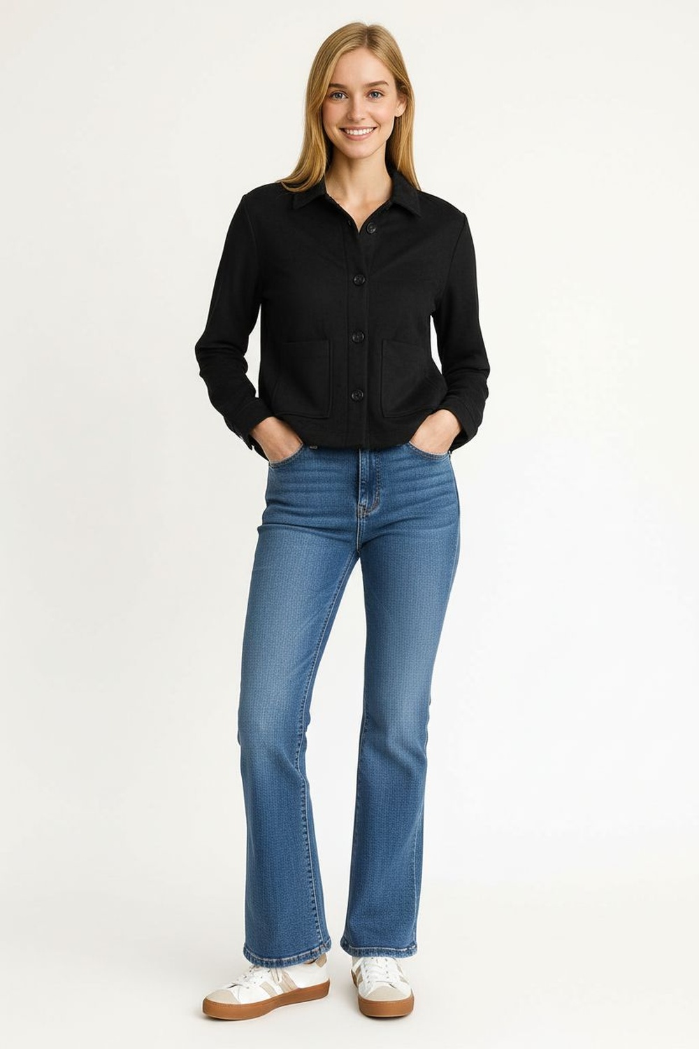 Chaqueta corta de corte crop con cuello camisero que aporta estructura moderna, bolsillos frontales con tapa que brindan detalle funcional y estético, cierre con botones que aseguran ajuste práctico y cómodo, manga larga con puño ajustado que ofrece versatilidad y estilo, confección en tela resistente de acabado pulido que mantiene su forma, ideal para complementar looks casuales y modernos de temporada