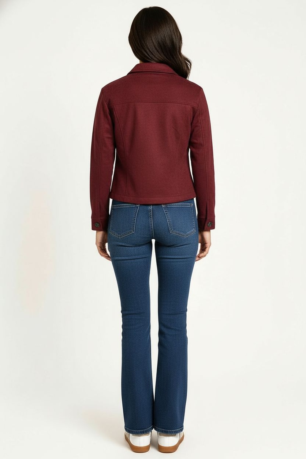 Chamarra corta confeccionada en tejido de paño con textura suave, cuello camisero estructurado que aporta un acabado pulido, cierre metálico al frente que facilita el ajuste, bolsillos tipo parche amplios que brindan practicidad y diseño con corte recto que favorece la caída natural de la prenda