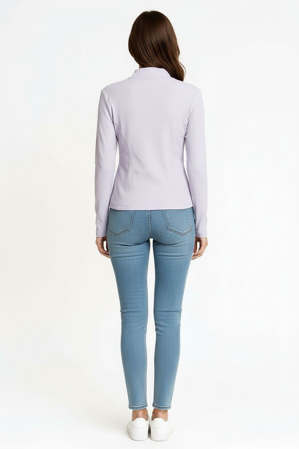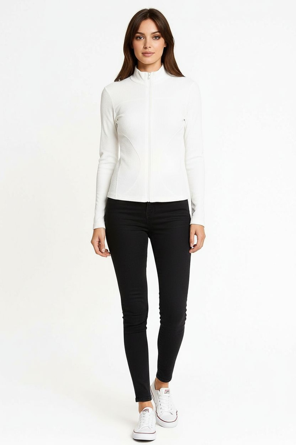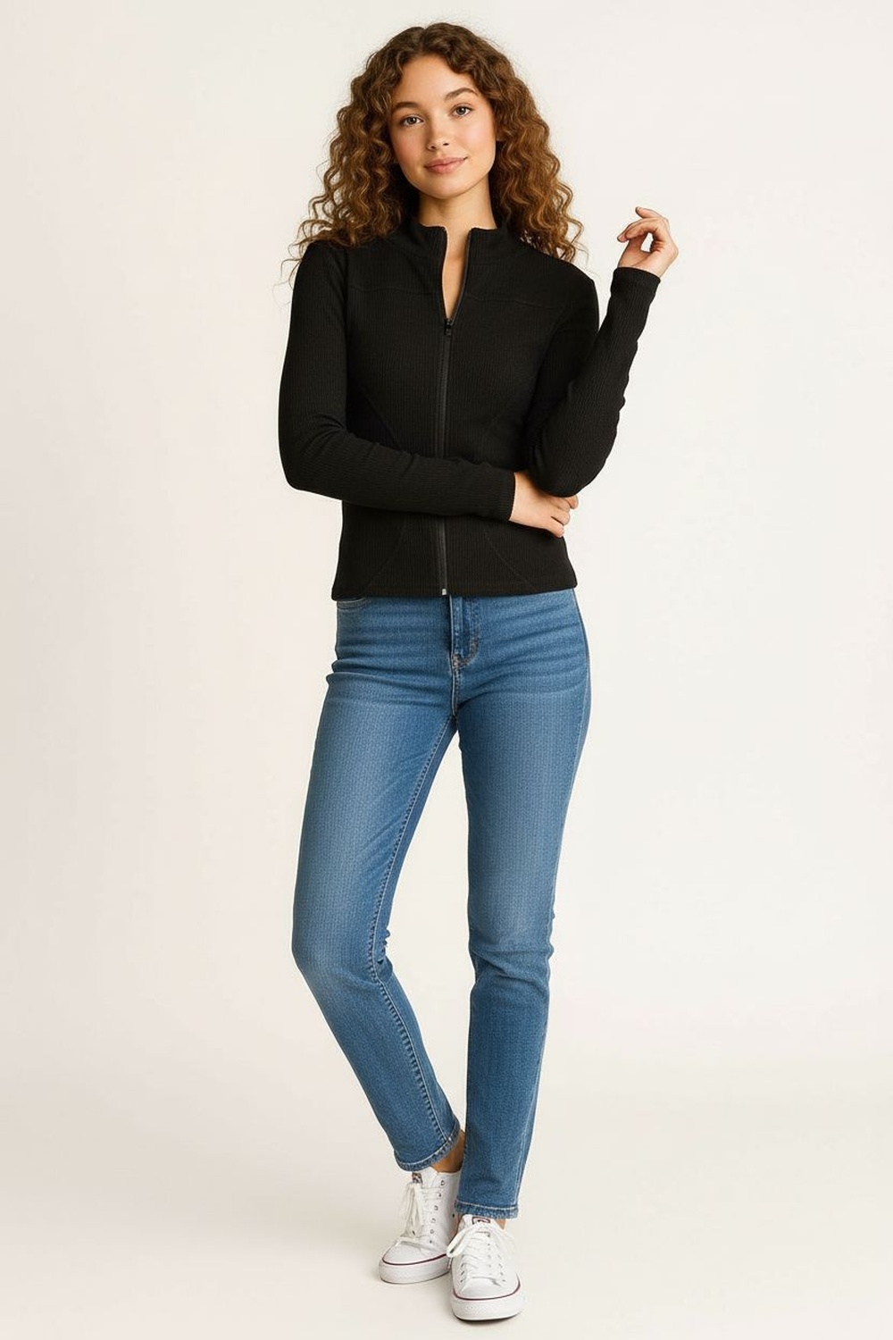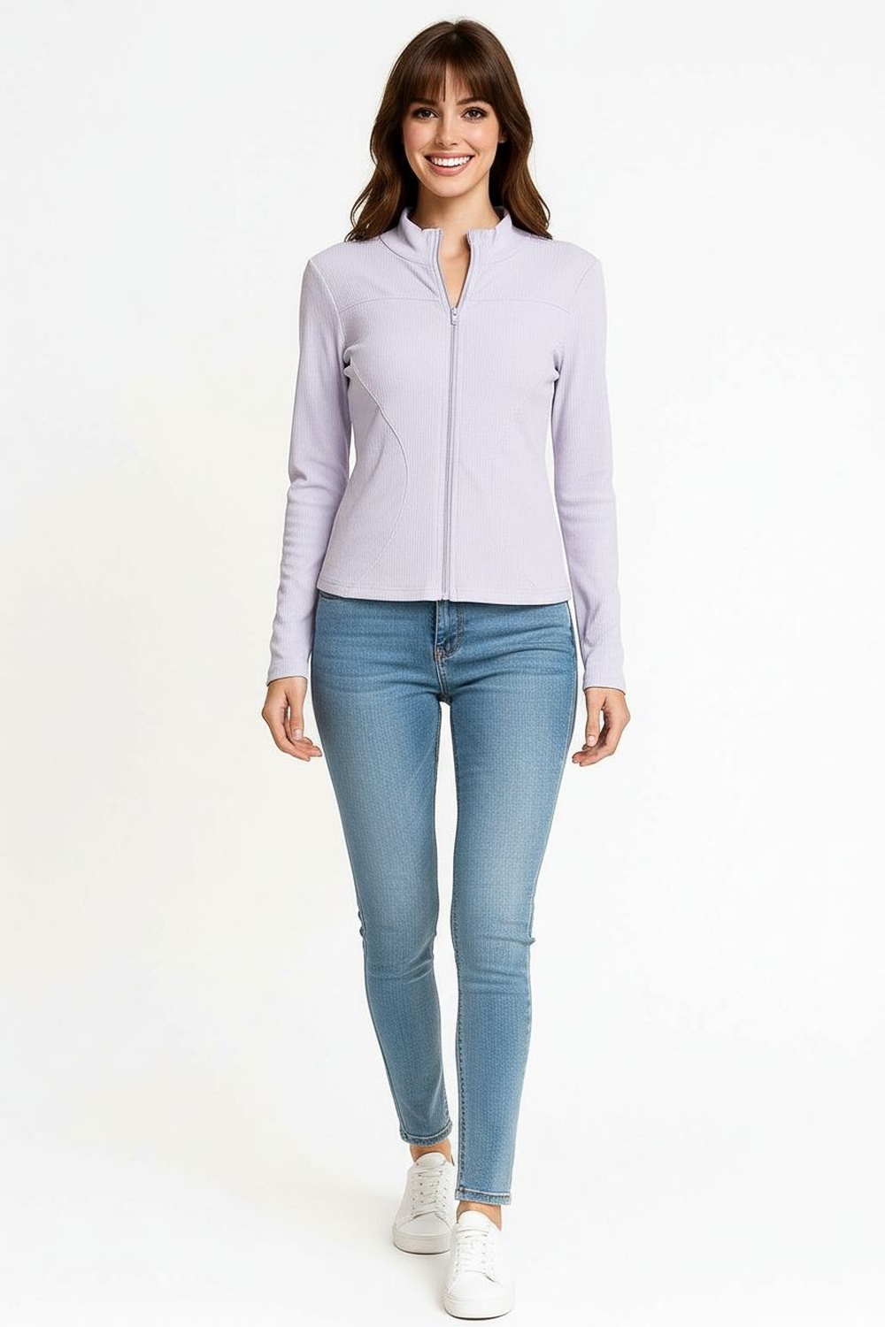 Chamarra ligera con cierre frontal cuello alto manga larga estructura ajustada textura acanalada terminación recta confección cómoda para uso diario