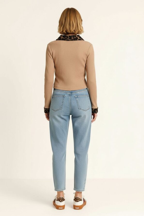 Chamarra corta de mezclilla con terminación deshilada en el borde inferior que aporta un look moderno y juvenil, cuello camisero estructurado que realza el diseño clásico, cierre frontal con botones metálicos que aseguran resistencia y durabilidad, bolsillos frontales de solapa con detalles de tiras brillantes que añaden un toque llamativo y sofisticado, manga larga con puños ajustables que permiten mayor comodidad
