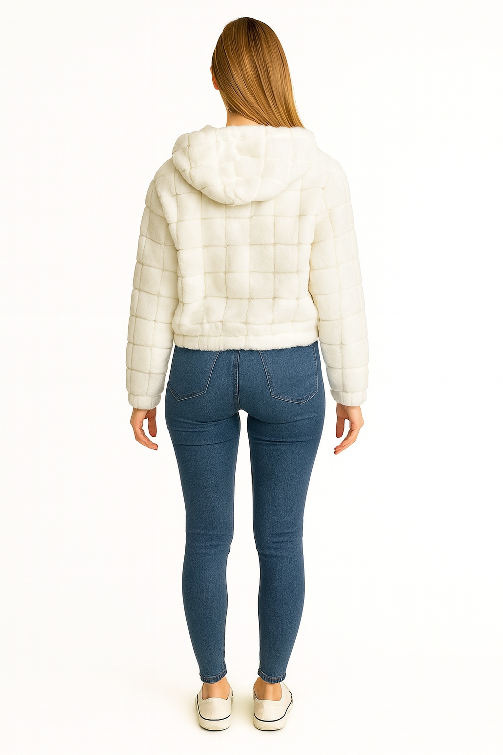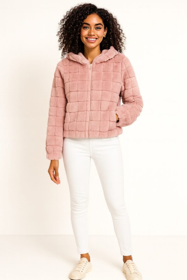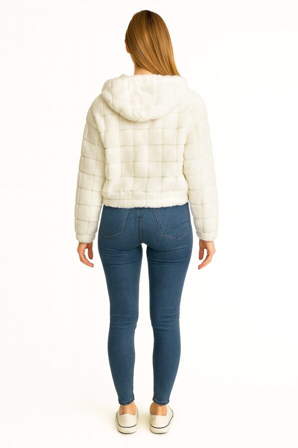 Chamarra de manga larga confeccionada en tela sherpa suave que aporta calidez, diseño acolchado a cuadros que añade textura y estilo, capucha integrada que brinda mayor protección en climas fríos, cierre frontal completo que facilita su uso, prenda ideal para outfits casuales y combinaciones acogedoras de temporada