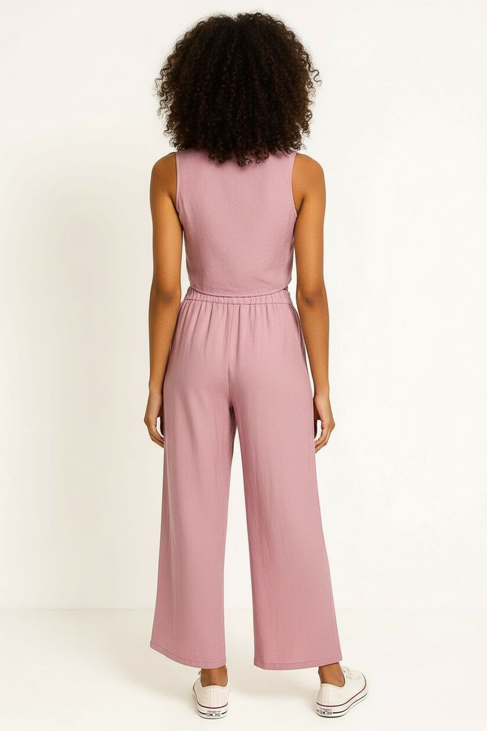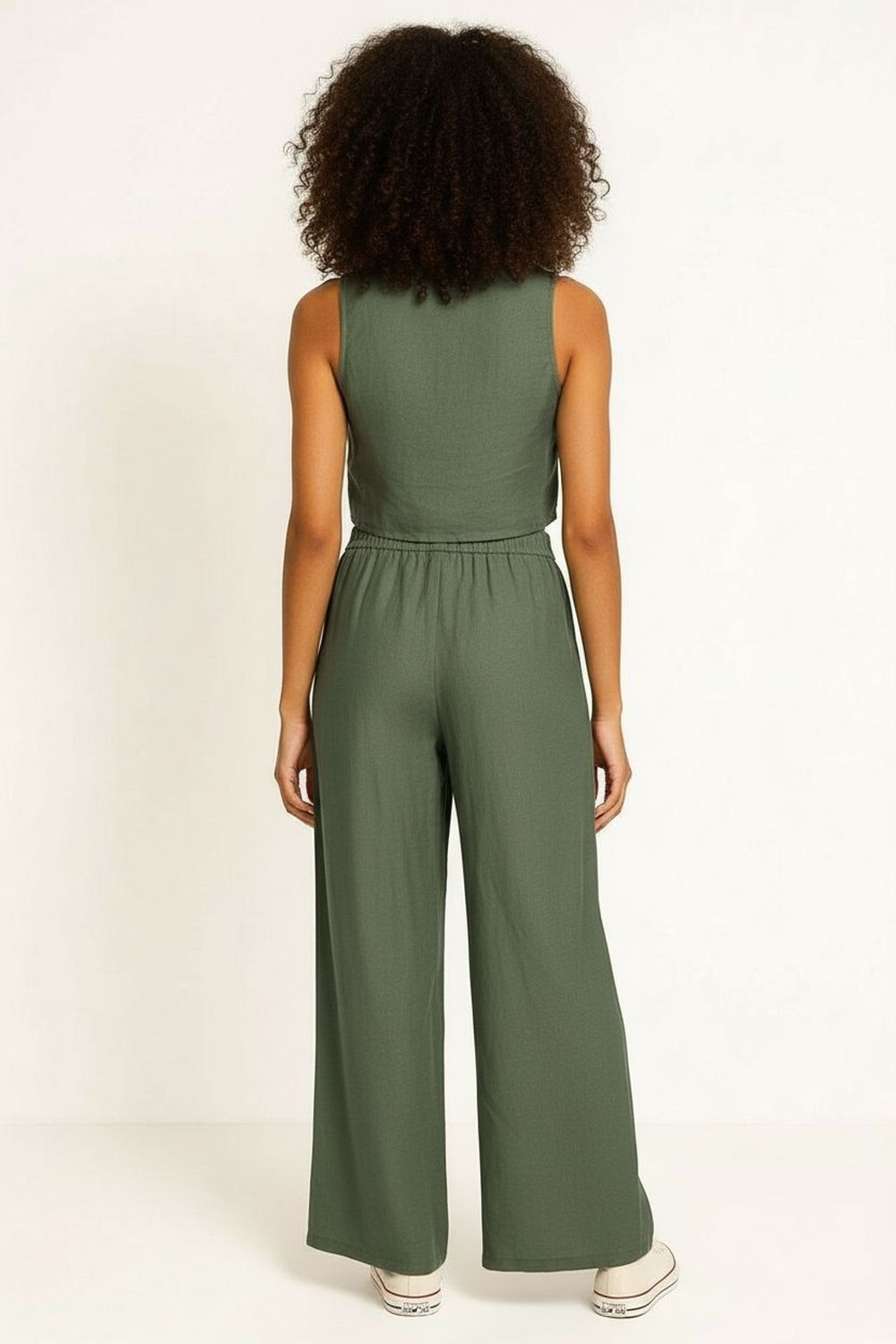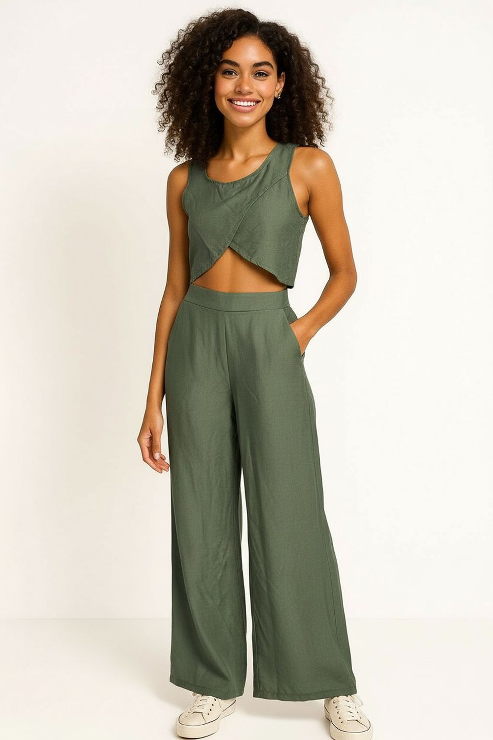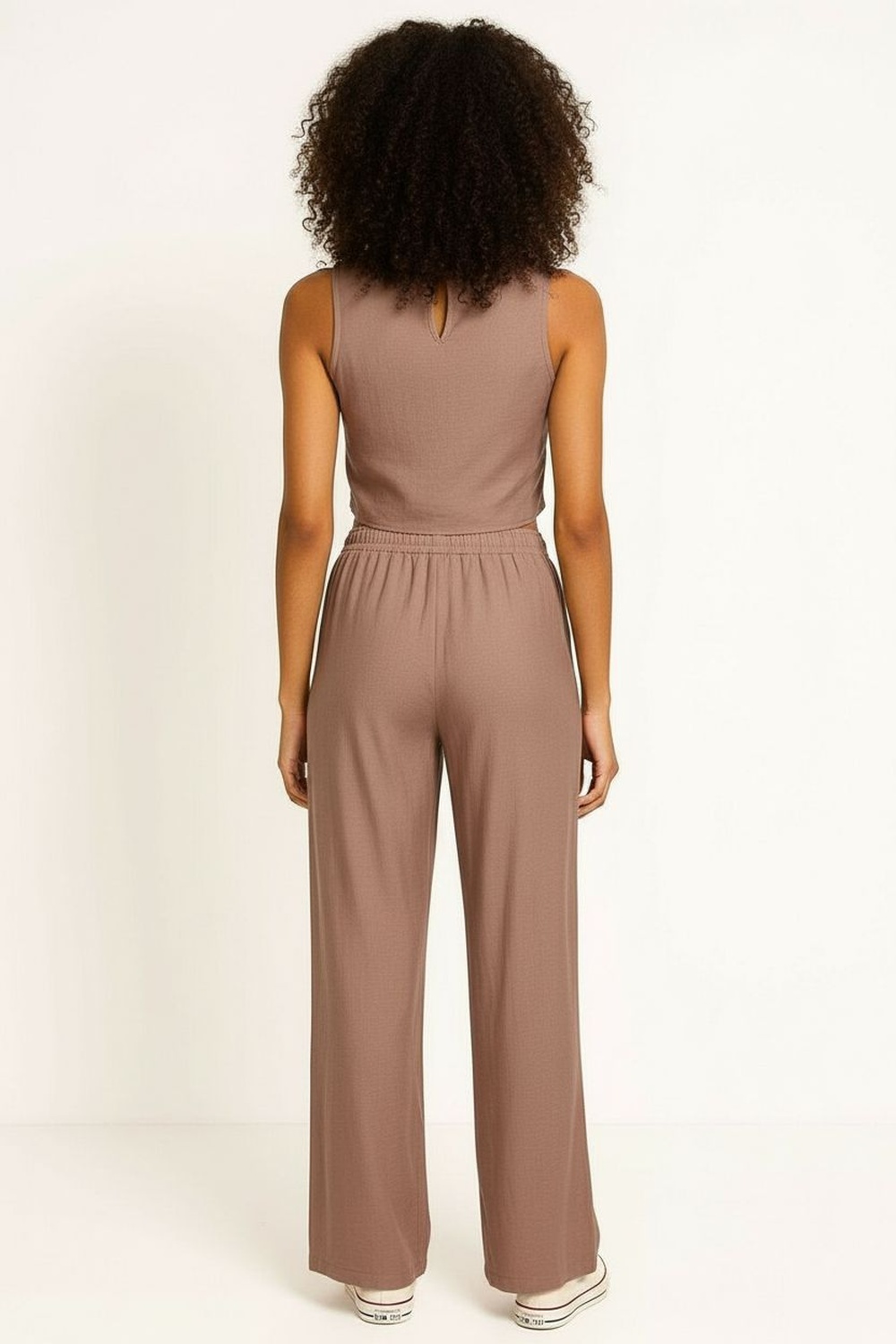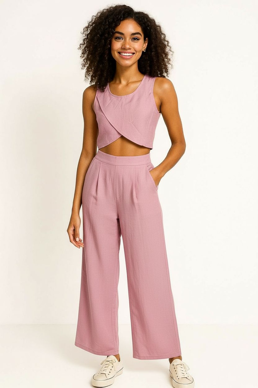 Conjunto de blusa sin mangas con escote redondo y corte asimétrico, pantalón de tiro alto con pretina, pierna amplia y caída recta, estructura ligera y ajuste cómodo
