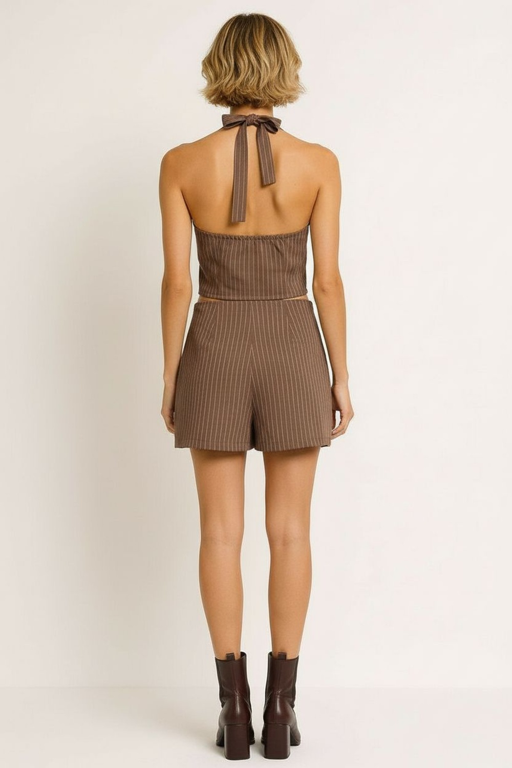 Conjunto de dos piezas con chaleco de escote profundo y cierre frontal, falda corta de corte recto con ajuste cómodo, confección en tejido estructurado de tacto firme, diseño coordinado que aporta armonía visual, acabados definidos que mantienen la forma