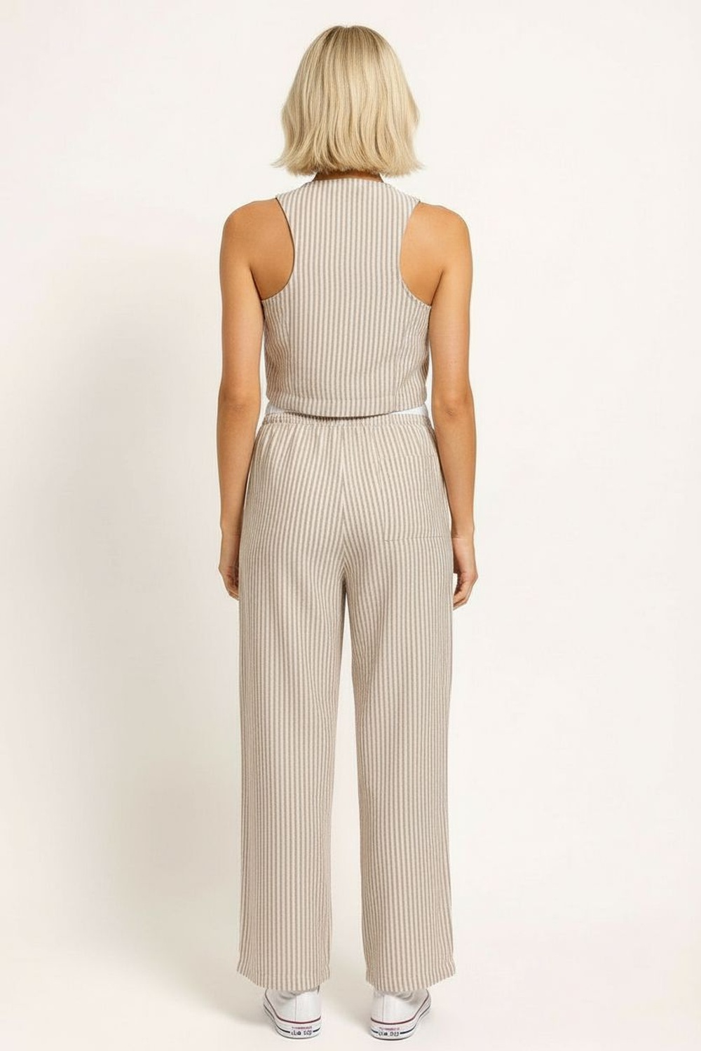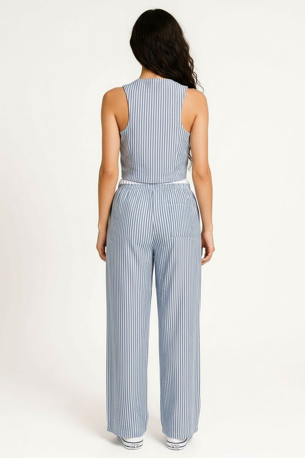 Conjunto con chaleco de escote en V y botonadura frontal, corte corto que marca la cintura, acabado estructurado con ajuste favorecedor en torso, pantalón de tiro medio con pretina elástica y pierna amplia de caída recta que brinda comodidad y movimiento, confección ligera de textura suave al tacto