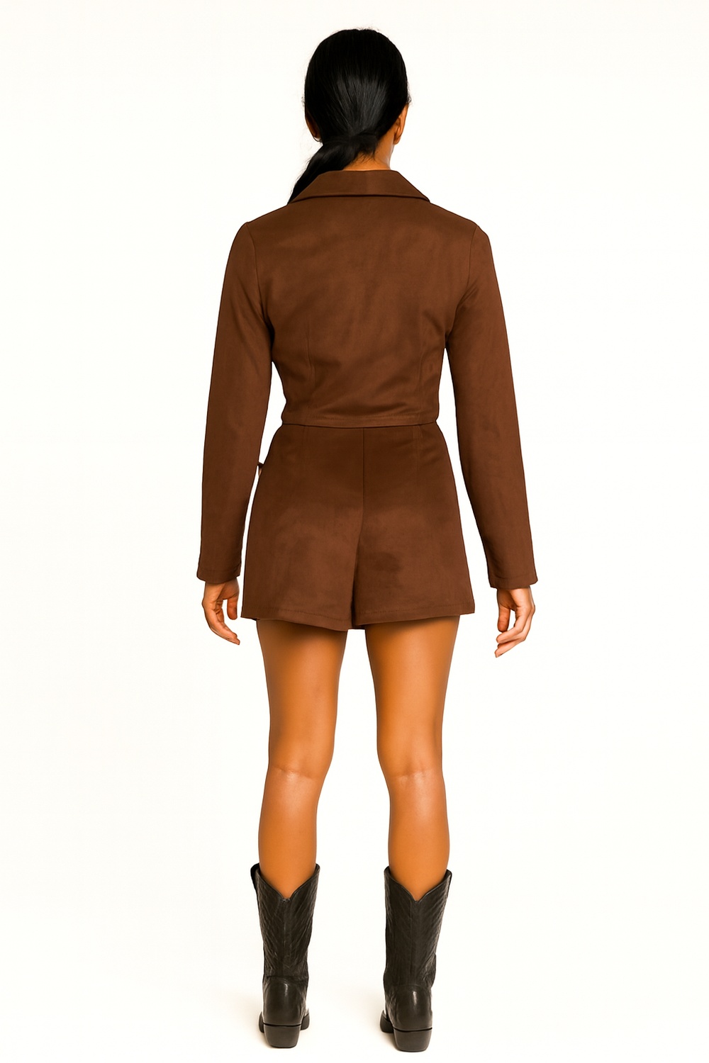 Conjunto compuesto por saco crop de manga larga con solapa clásica y cierre de botón al frente que aporta elegancia, falda short de tiro alto con amarre lateral que brinda seguridad y comodidad, confección en tejido tipo gamuza suave al tacto que ofrece sofisticación, ideal para crear looks modernos y versátiles de temporada