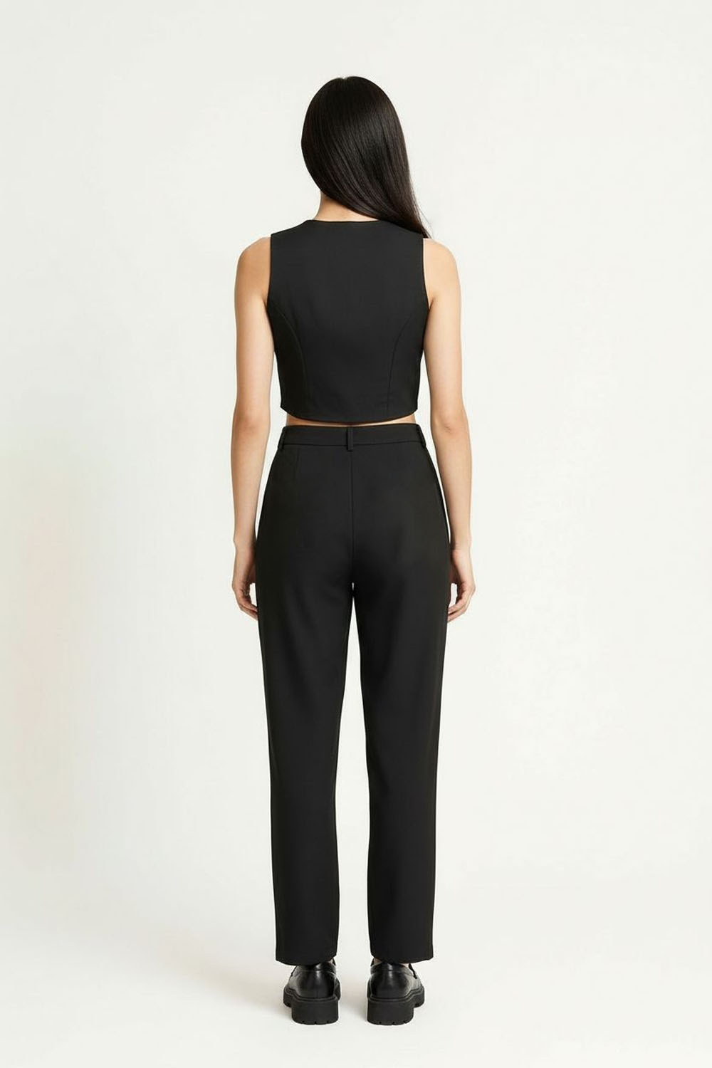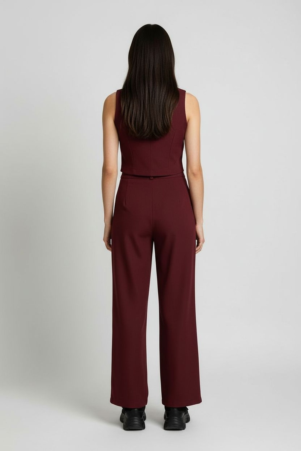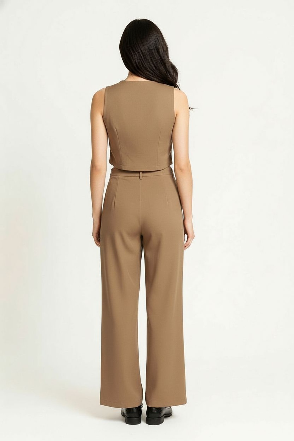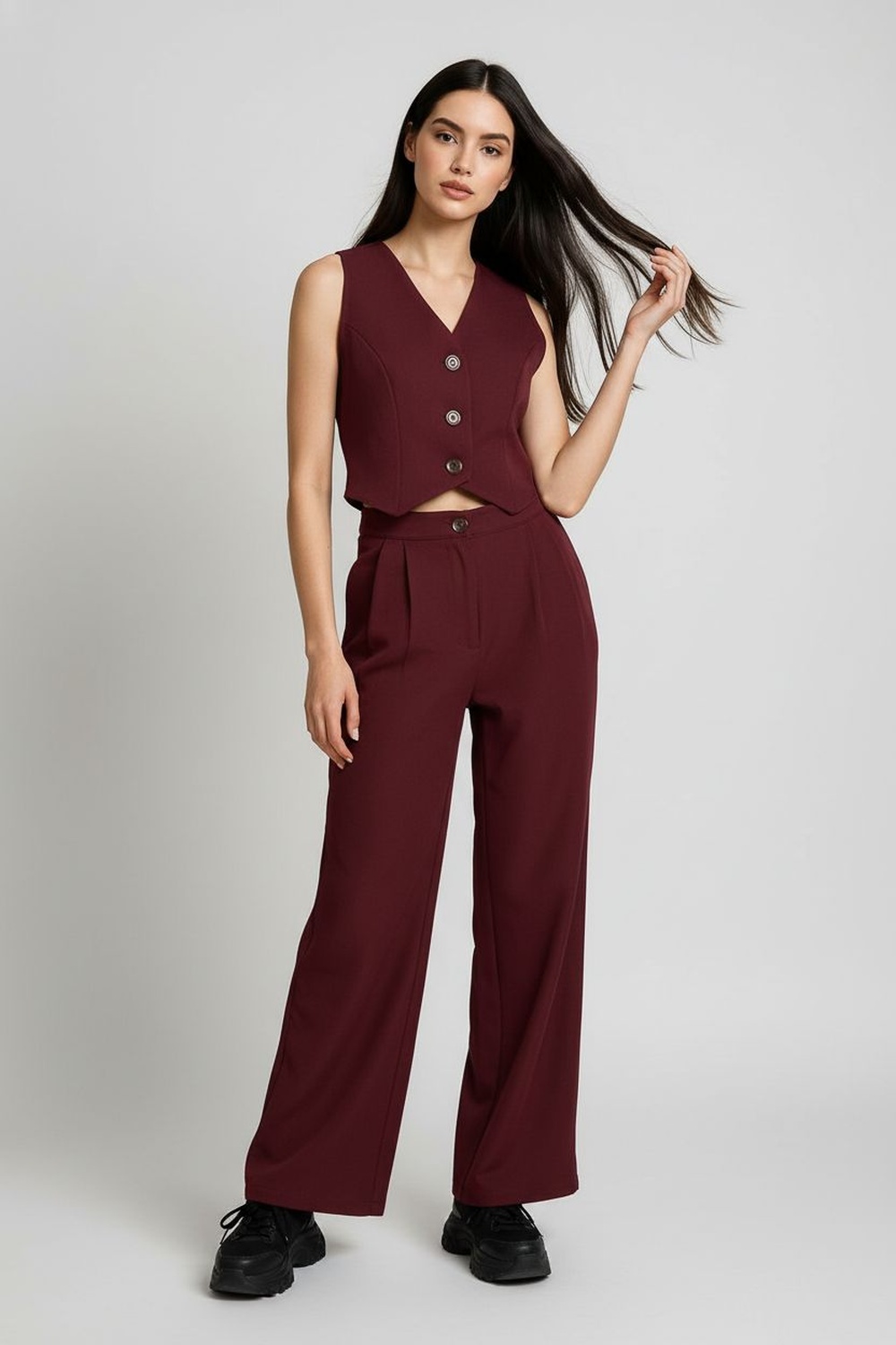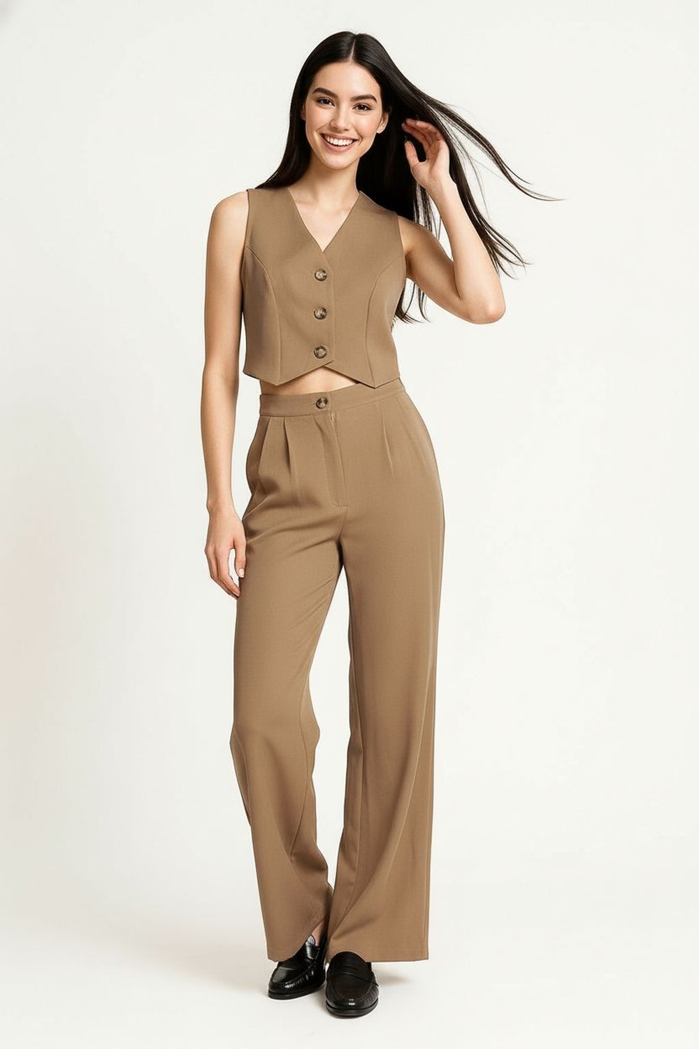 Conjunto compuesto por chaleco escotado con cierre de botones frontales y ajuste entallado que resalta la silueta, pantalón de corte amplio con pretina suave que brinda comodidad durante el movimiento, confección en tela fluida que aporta caída elegante y ligereza, acabado limpio que ofrece una apariencia moderna y sofisticada para distintas ocasiones
