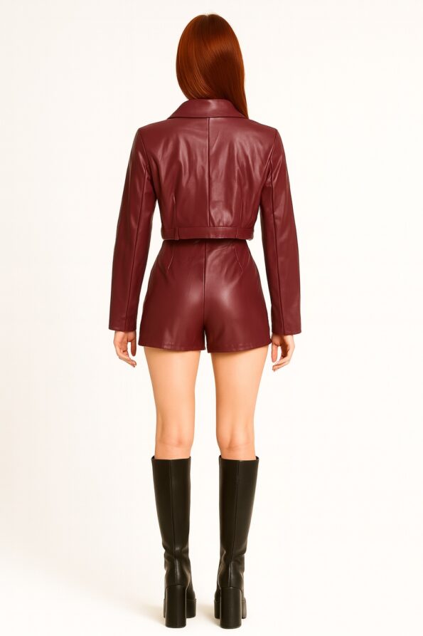 Conjunto elaborado en material tipo pvc con acabado brillante que resalta el diseño moderno, saco corto con solapa amplia y cierre frontal con botón, falda short de tiro alto con estructura firme que define la figura, confección con costuras reforzadas que garantizan durabilidad y un ajuste seguro, ideal para looks atrevidos y contemporáneos