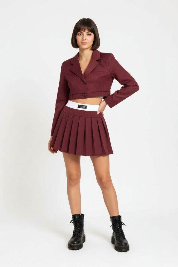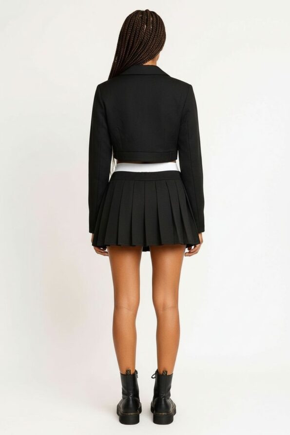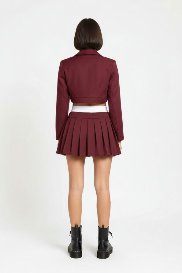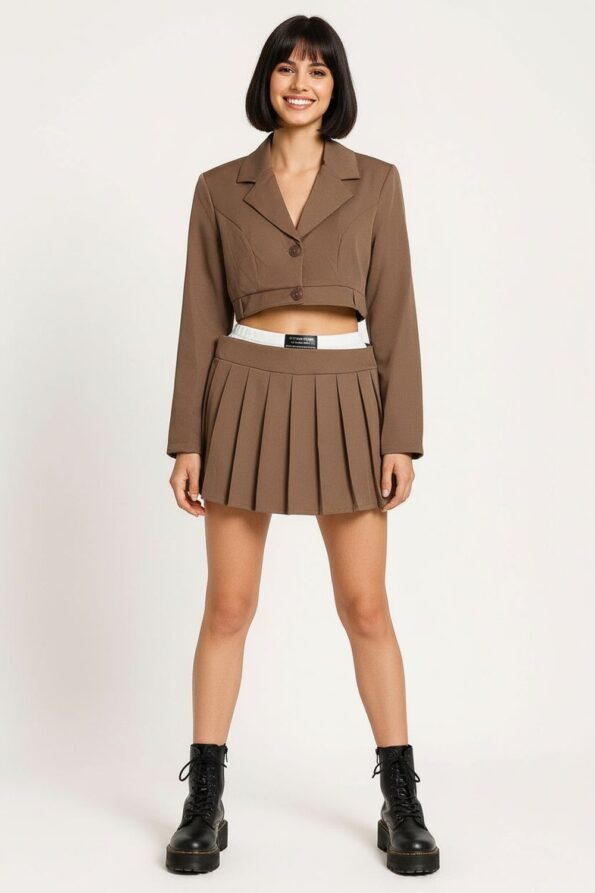 Conjunto de saco corto y falda tableada que combina elegancia con estilo juvenil, saco con cuello camisero y cierre frontal con botones que aporta estructura y un acabado moderno, falda de tiro alto con pretina ancha que brinda ajuste firme y favorecedor, diseño de tablones que añade movimiento y dinamismo, confección en tela suave y resistente que asegura comodidad y durabilidad