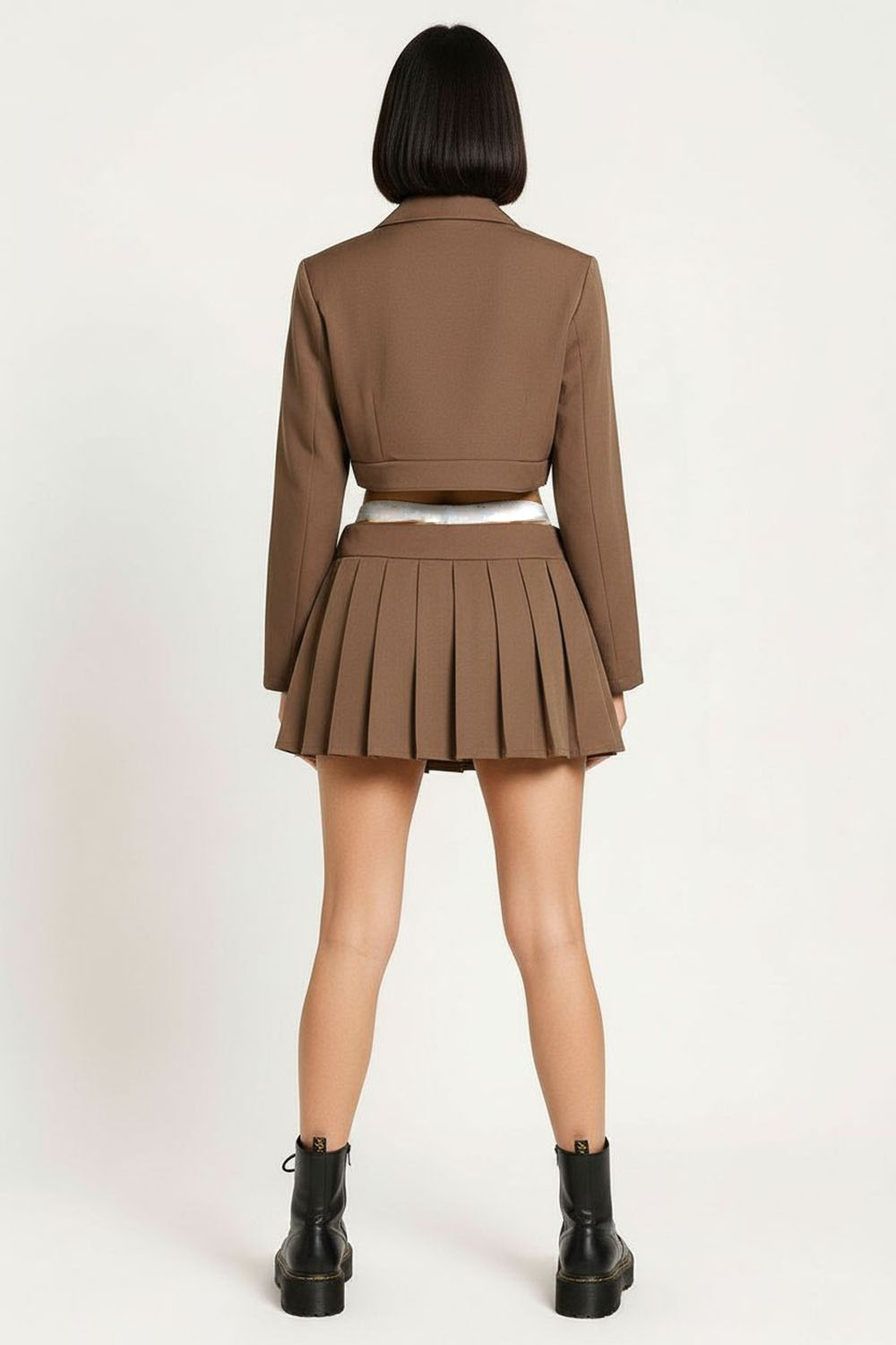 Conjunto de dos piezas compuesto por saco corto de manga larga con solapa amplia y botones frontales que aportan un estilo sofisticado, ajuste ceñido que realza la silueta, minifalda tableada con pretina ancha que brinda comodidad y seguridad, confección en tela estructurada que mantiene la forma, ideal para outfits modernos y elegantes de temporada