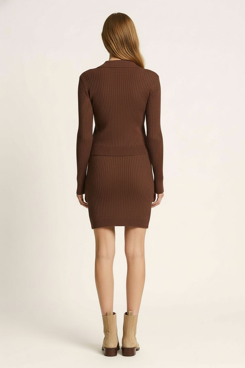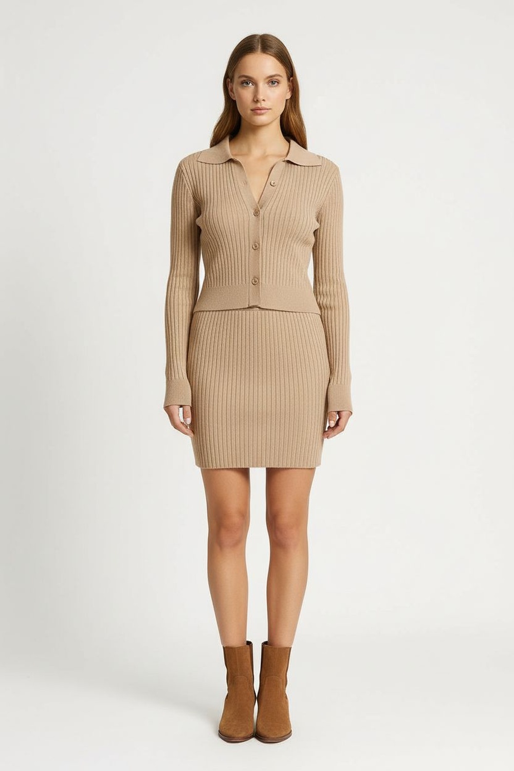 Conjunto de dos piezas elaborado en tejido de poliviscosa de textura suave, playera de manga larga con cuello tipo camisa y botones frontales que definen la estructura, falda de tiro alto con pretina ancha que aporta ajuste cómodo, confección que equilibra elegancia y confort en un solo diseño