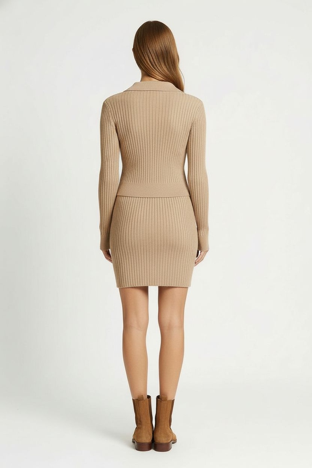 Conjunto compuesto por playera de punto acanalado con cuello polo contrastante y cierre corto al frente, falda corta con diseño tableado que aporta movimiento, confección en tejido elástico que ofrece confort y adaptabilidad, acabado que conserva su estructura tras el lavado