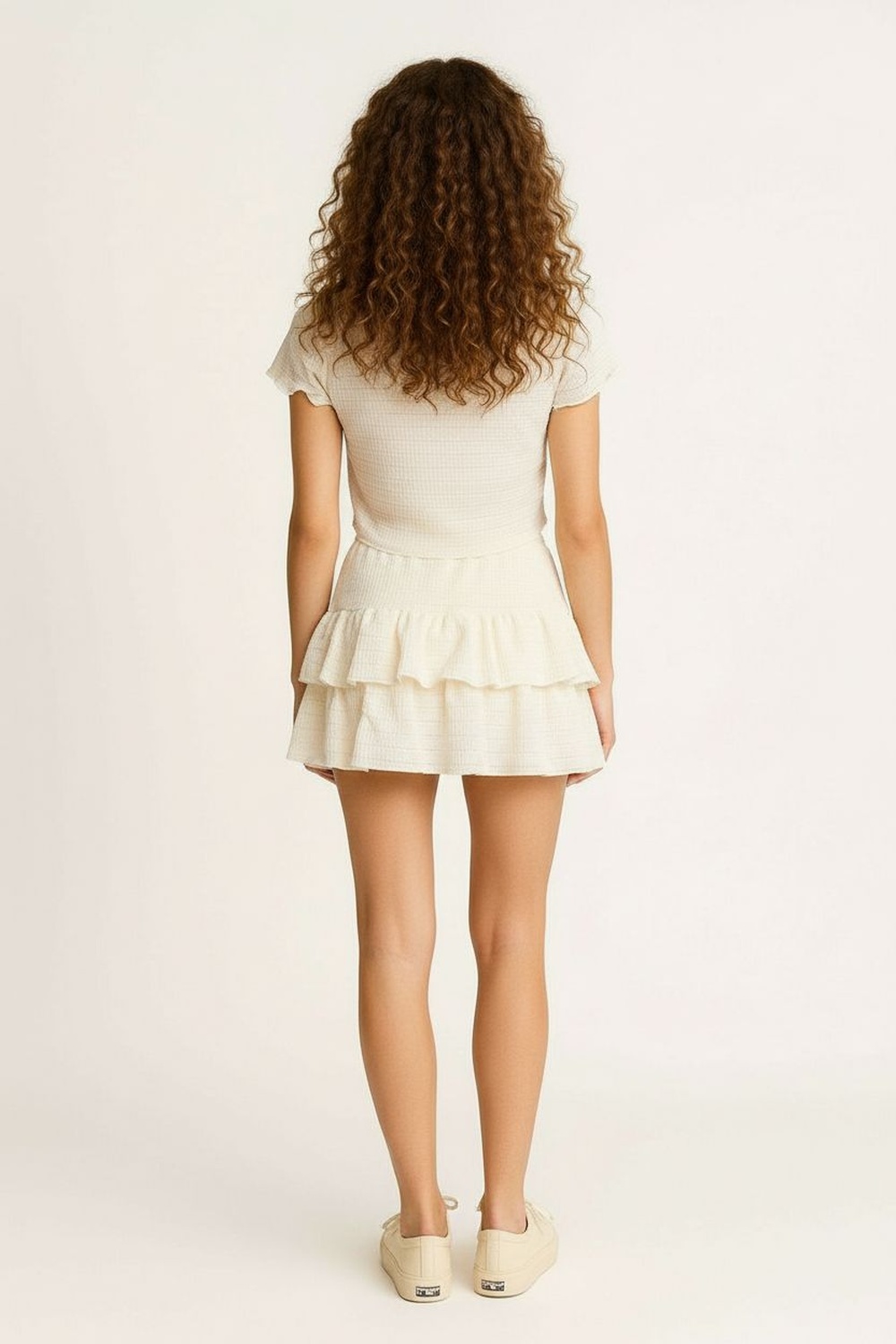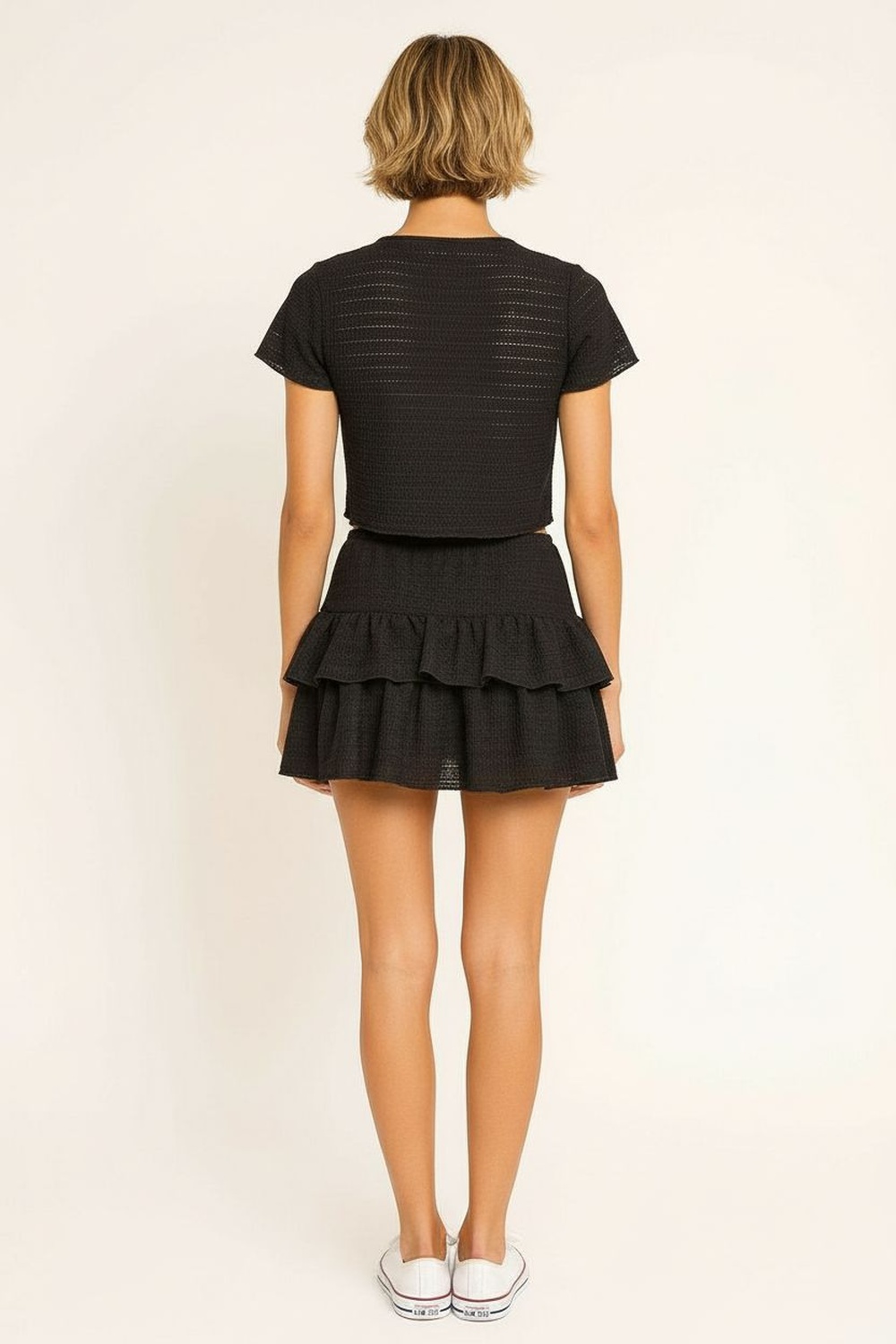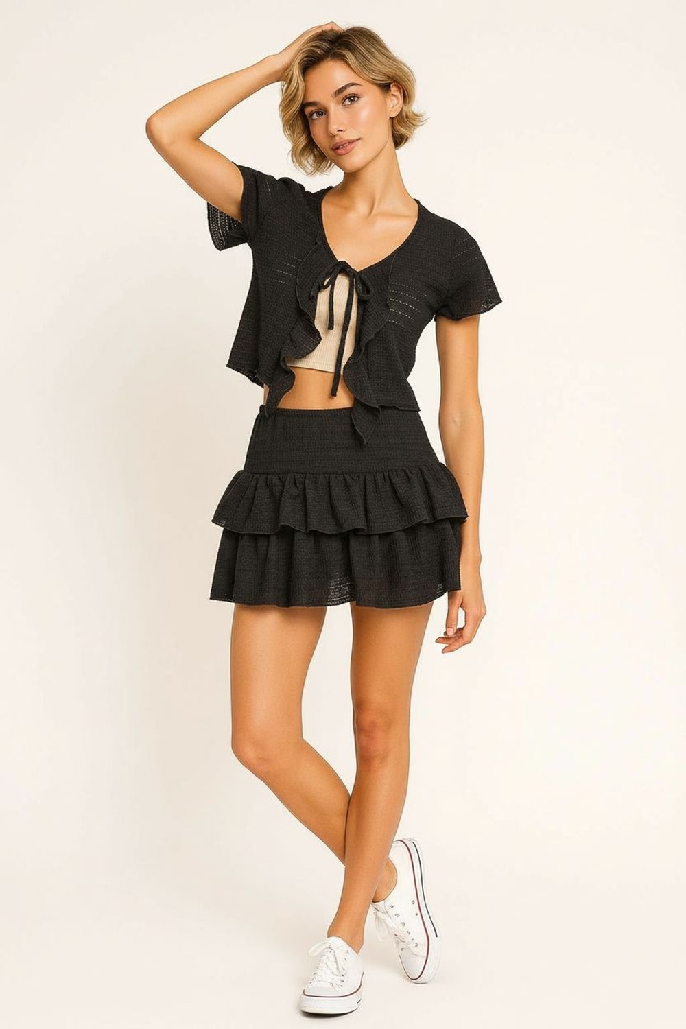 Conjunto tejido tipo crochet con bolero corto de manga corta y amarre frontal ajustable, escote profundo con acabado ondulado, falda corta de corte recto con olanes en capas que aportan movimiento, pretina cómoda que se adapta a la cintura, confección ligera y fresca con textura calada que realza la silueta