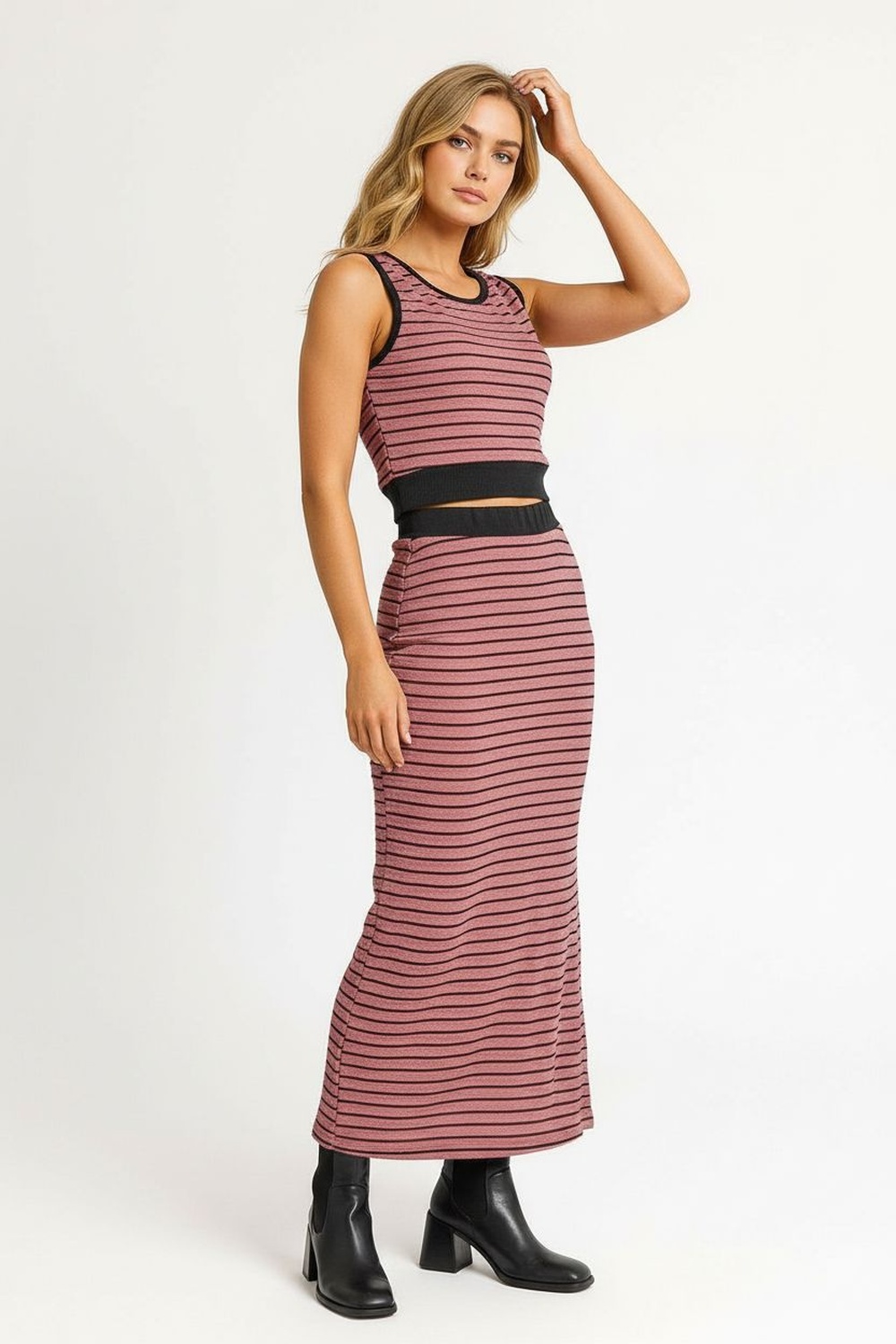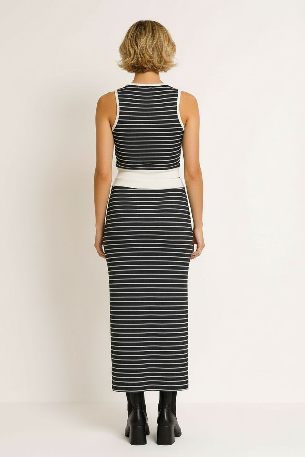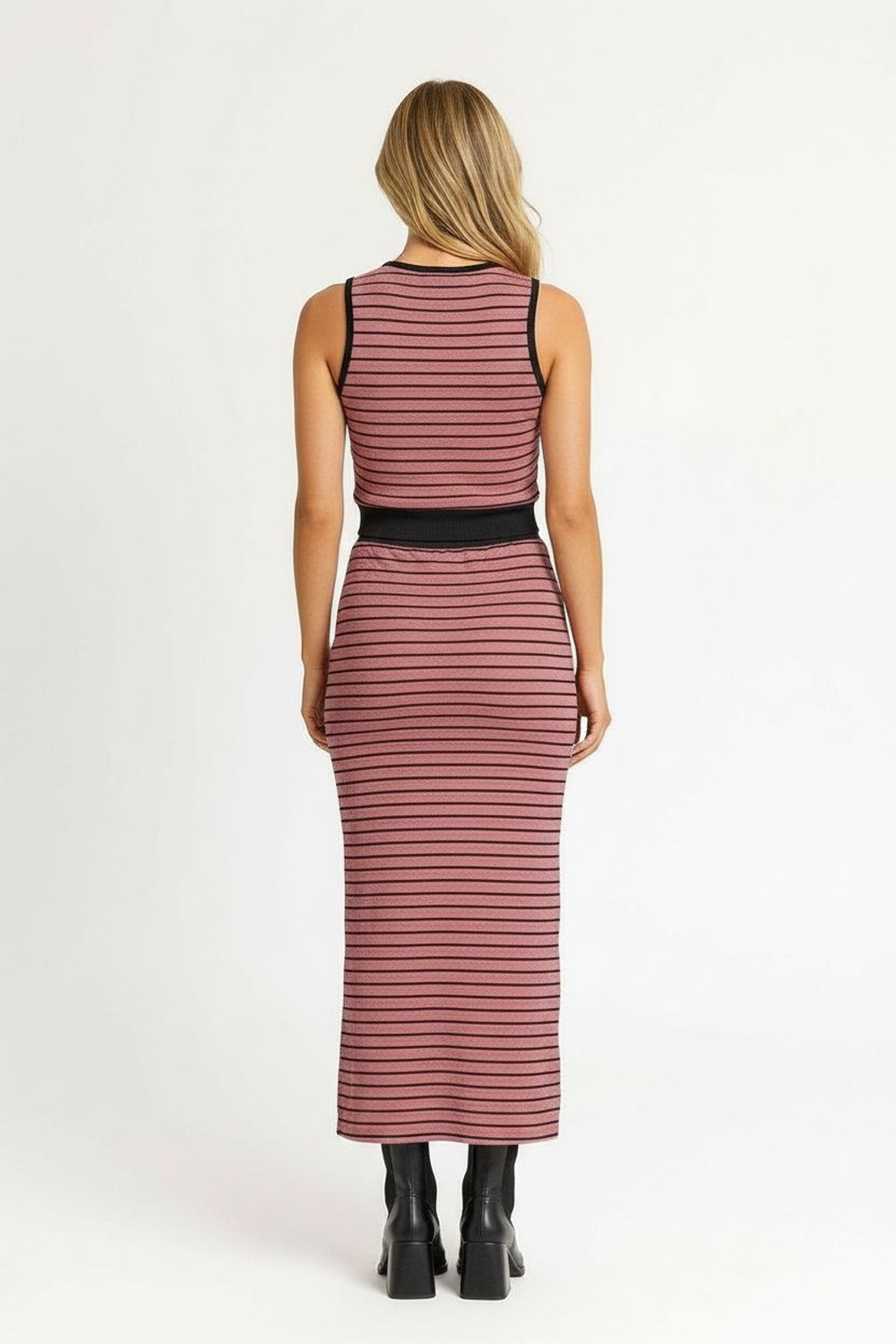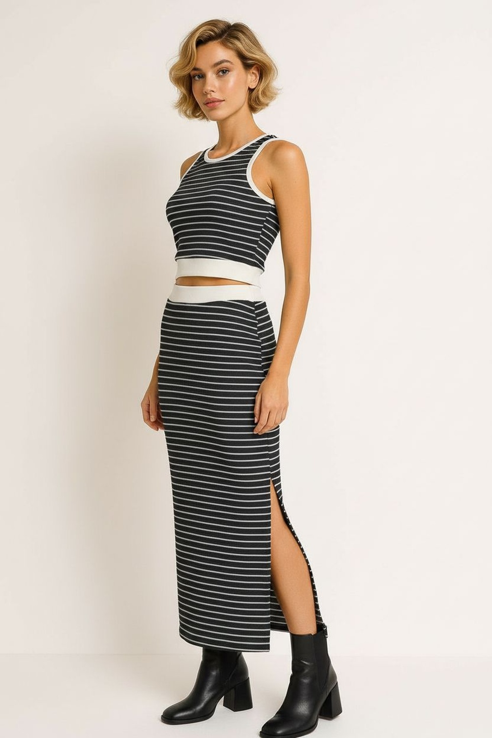 Conjunto de dos piezas con top sin mangas de corte recto, falda de largo midi con abertura lateral funcional, confección en tejido de punto con elasticidad ligera, ajuste cómodo que acompaña el movimiento, acabados prolijos que conservan la estructura