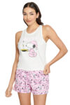 Conjunto compuesto por top corto con tirantes finos y detalles frontales decorativos, estructura que se ajusta de manera uniforme al torso, pantalón de tiro medio con corte ligeramente abierto en la parte baja, confección que equilibra firmeza y comodidad, caída continua que estiliza visualmente la figura