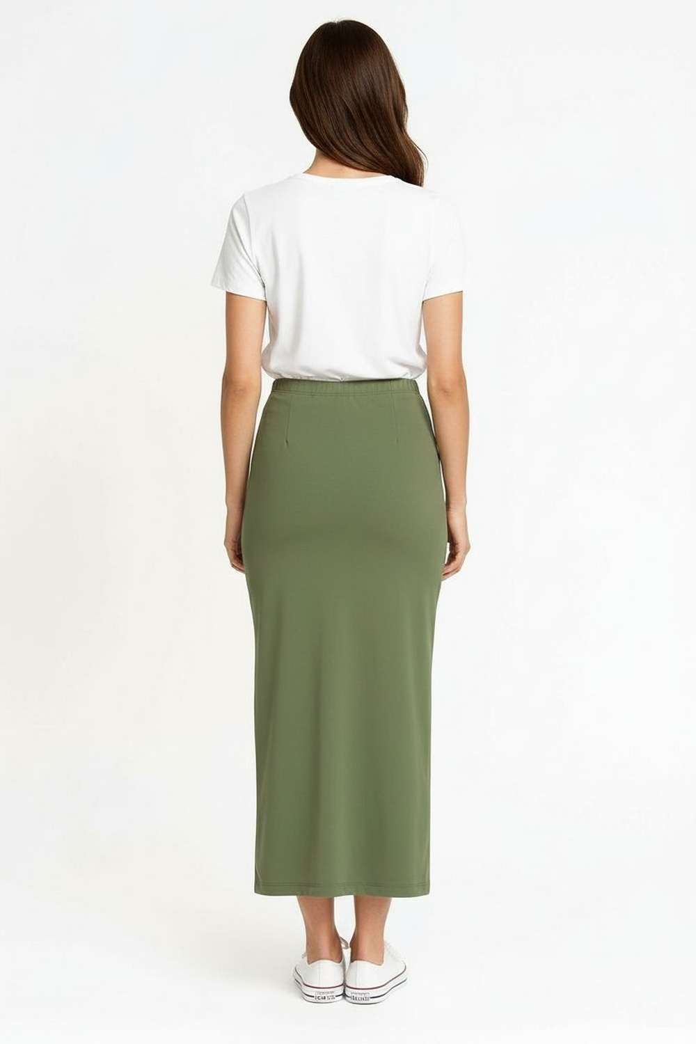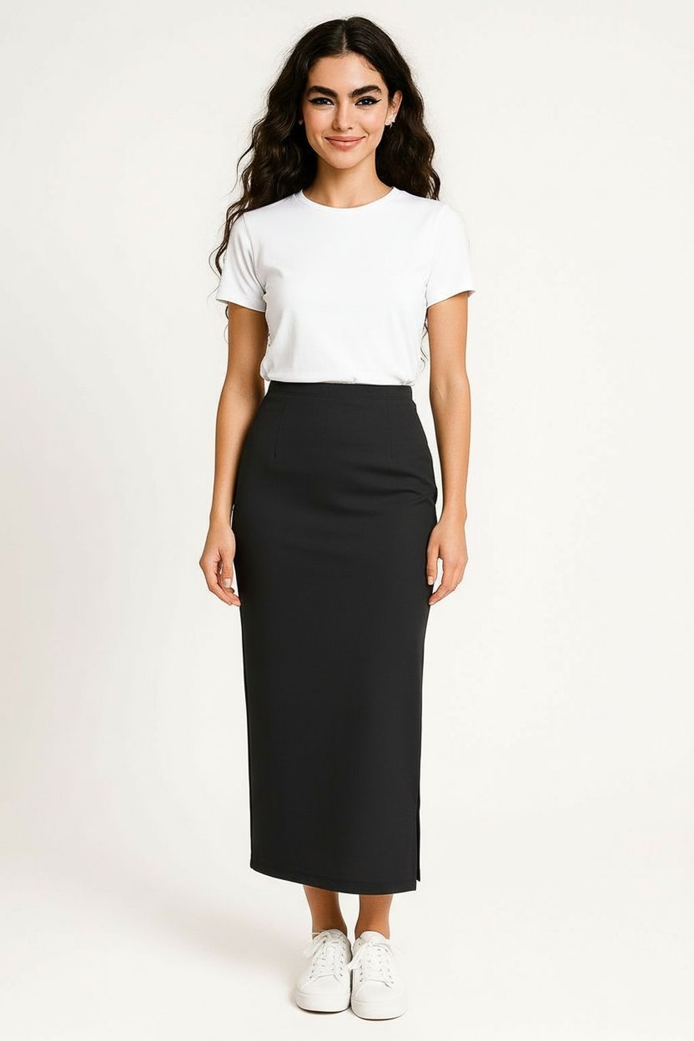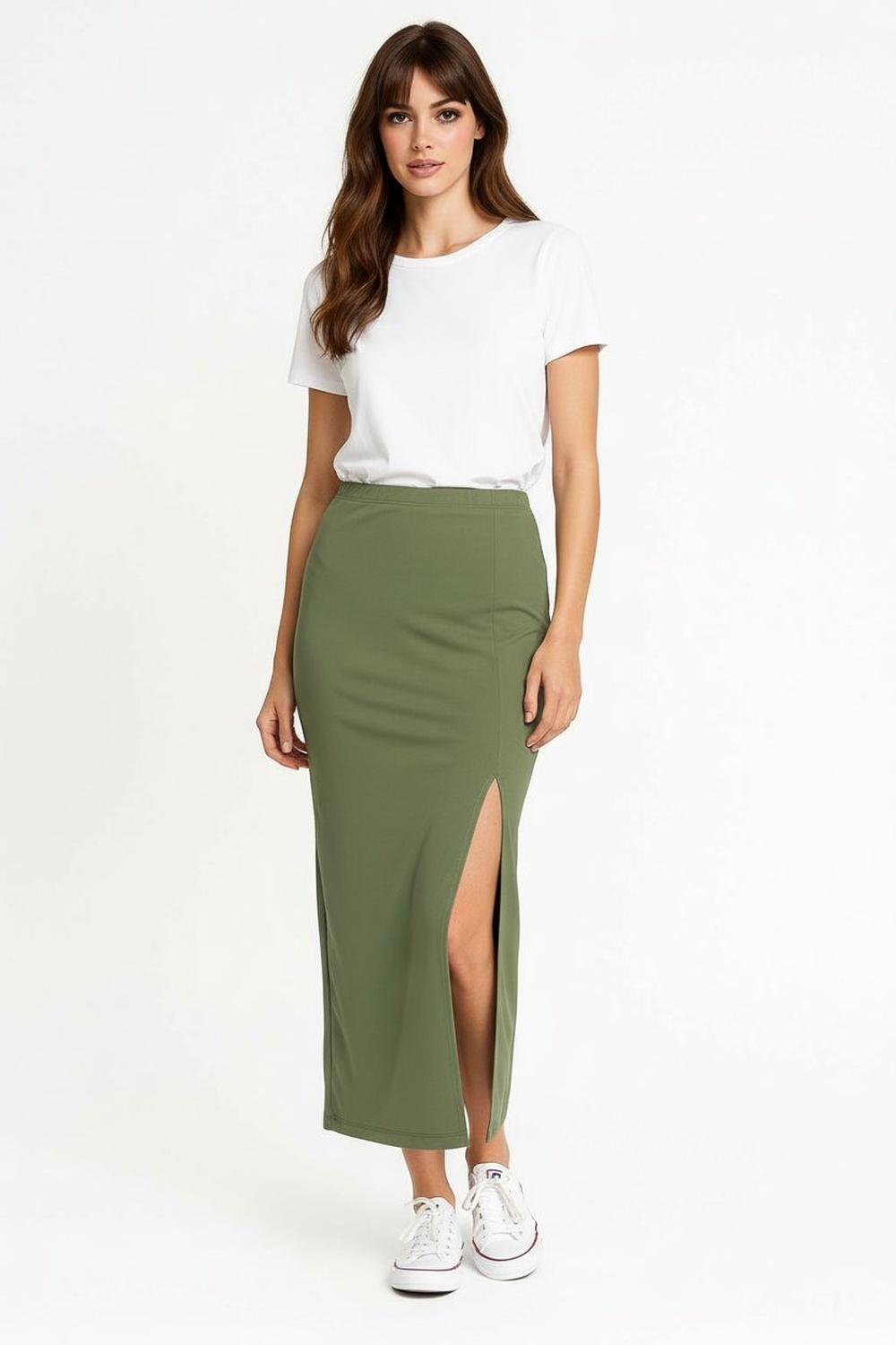 Maxifalda de pretina lisa, ajuste al cuerpo, abertura lateral pronunciada, estructura flexible, caída recta