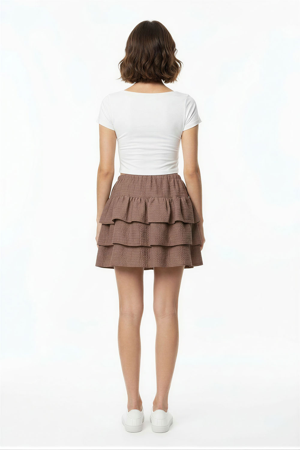 Falda corta de tiro alto con pretina amplia que brinda ajuste cómodo, diseño con olanes en capas que aporta movimiento y volumen, confección en tejido ligero con caída fluida que favorece la silueta, acabado suave al tacto que permite mayor comodidad en uso diario