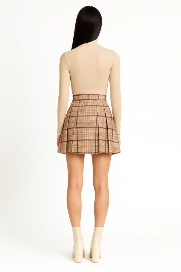 Falda corta con diseño de tablones que aporta volumen y movimiento dinámico, pretina ancha que asegura un ajuste firme y cómodo en la cintura, corte superior estructurado que realza la silueta, largo por encima de la rodilla que brinda un estilo juvenil y versátil, confección en tela resistente que conserva la forma de los pliegues y garantiza durabilidad
